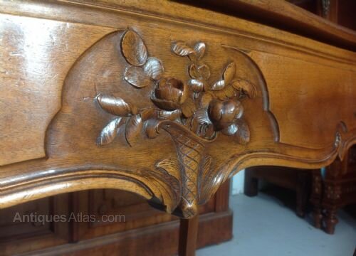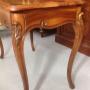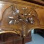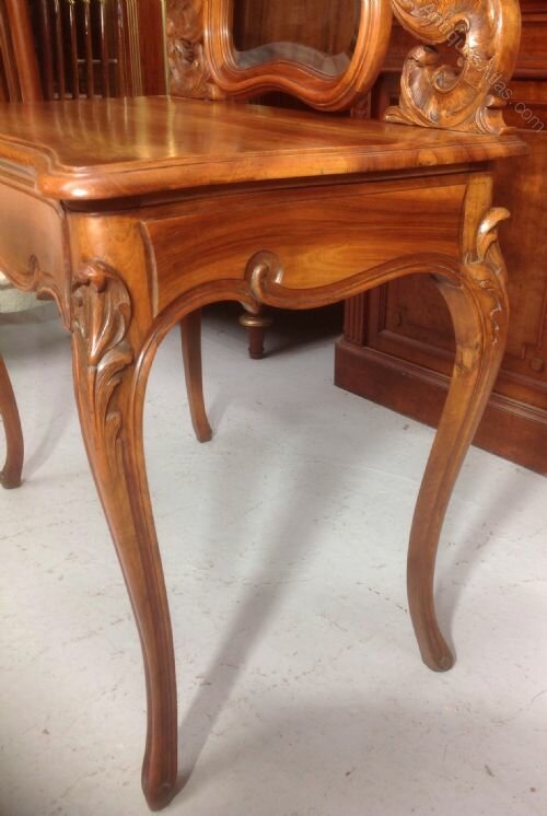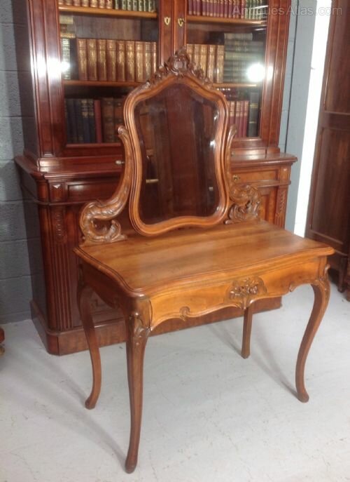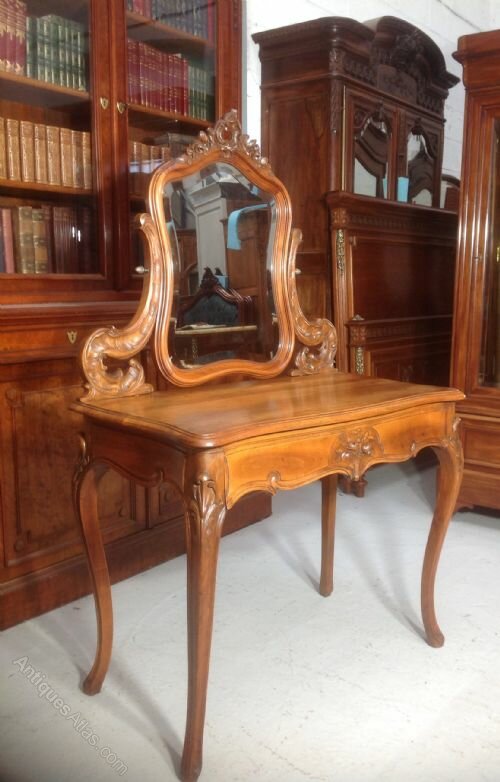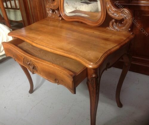 The dressing table has a solid walnut top with a moulded edge, there is a serpentine drawer with floral carving.