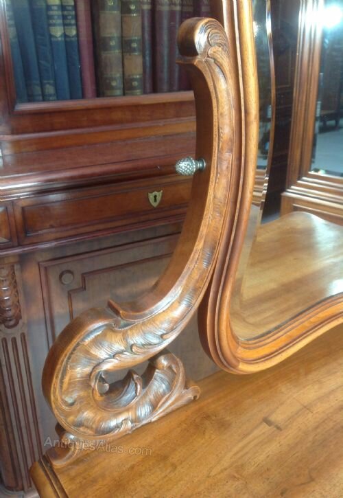 The dressing table has a lovely shaped mirror with a carved top, the mirror is supported by carved swept arms.