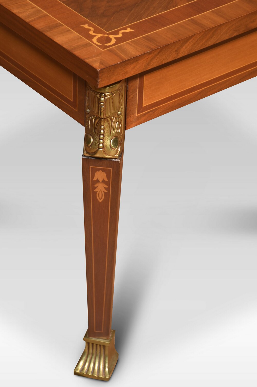 Walnut inlaid coffee table, the inlaid top with floral swag and string inlay. All raised on square tapering legs terminating in brass feet.