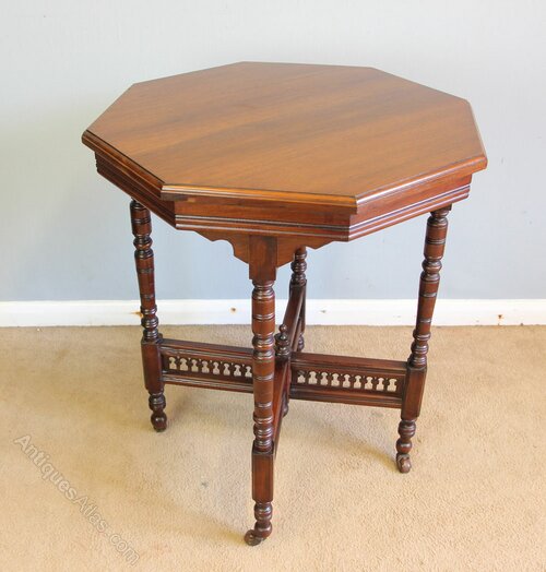 Antique Walnut Octagonal Occasional Lamp Centre Table. This Antique octagonal walnut lamp / centre table has a lovely walnut top with moulded edge and walnut skirt under. All supported by four turned legs and four decorative stretchers with centre. This type of table looks lovely in a bay window.