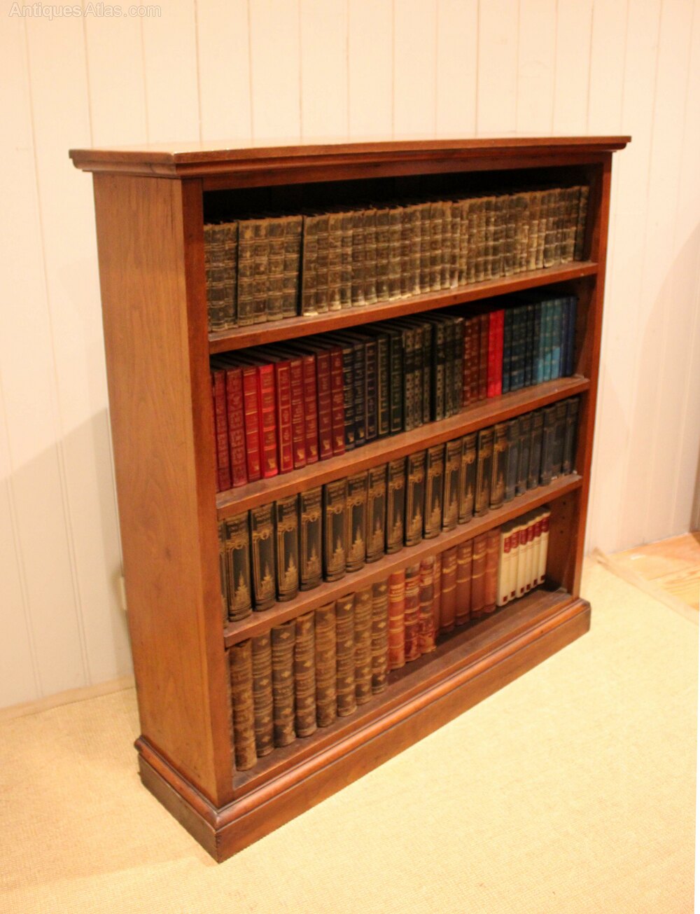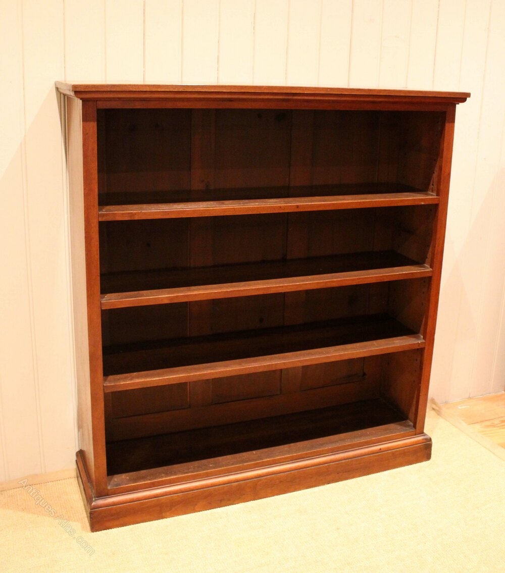 Walnut open bookcase having three adjustable shelves , raised on a plinth base .