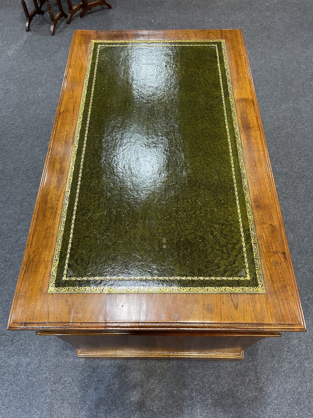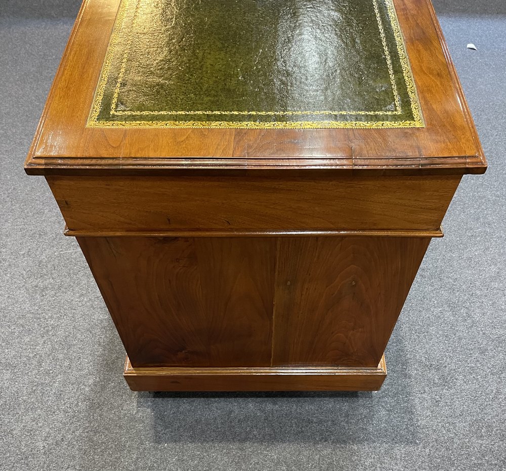 A lovely small walnut Victorian Pedestal Desk. This desk has nine drawers all with dovetailed construction. They all run very smoothly and have working locks and keys. The pedestals run smoothly on the original castors . The leather tooled top is in excellent condition. The back is finished in the same walnut veneer giving a lovely all round finish.