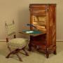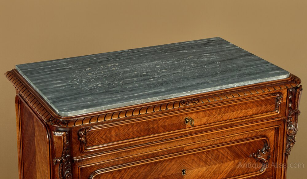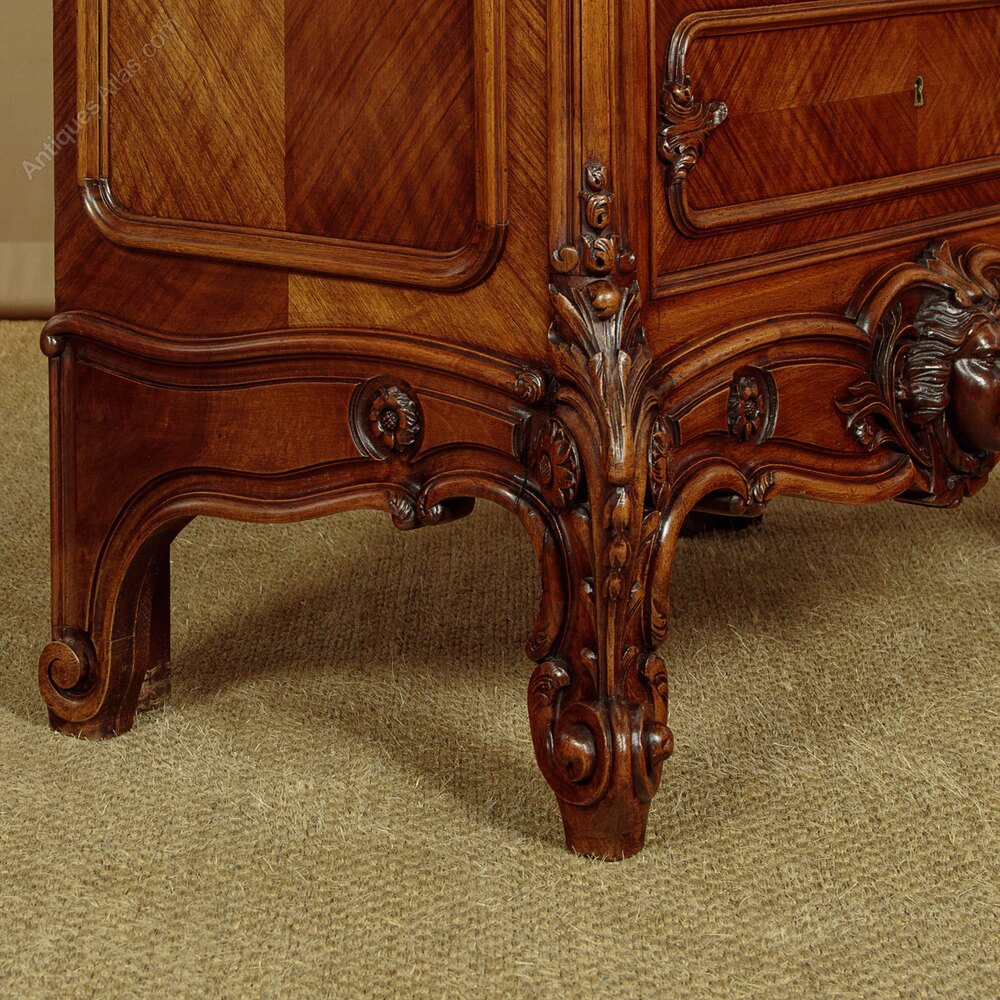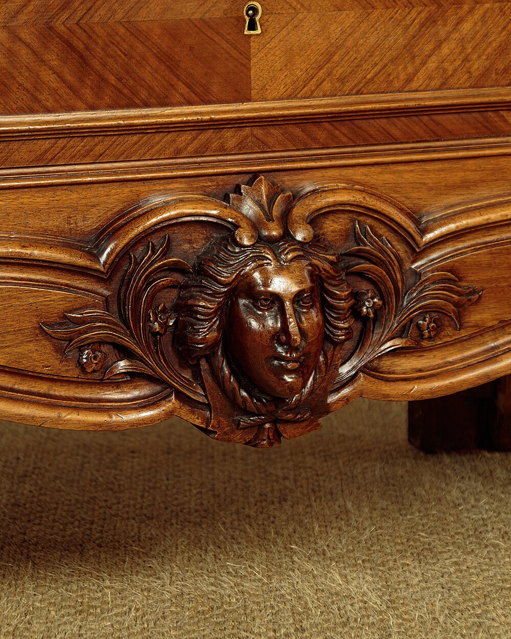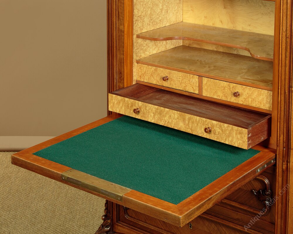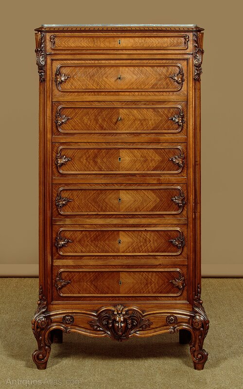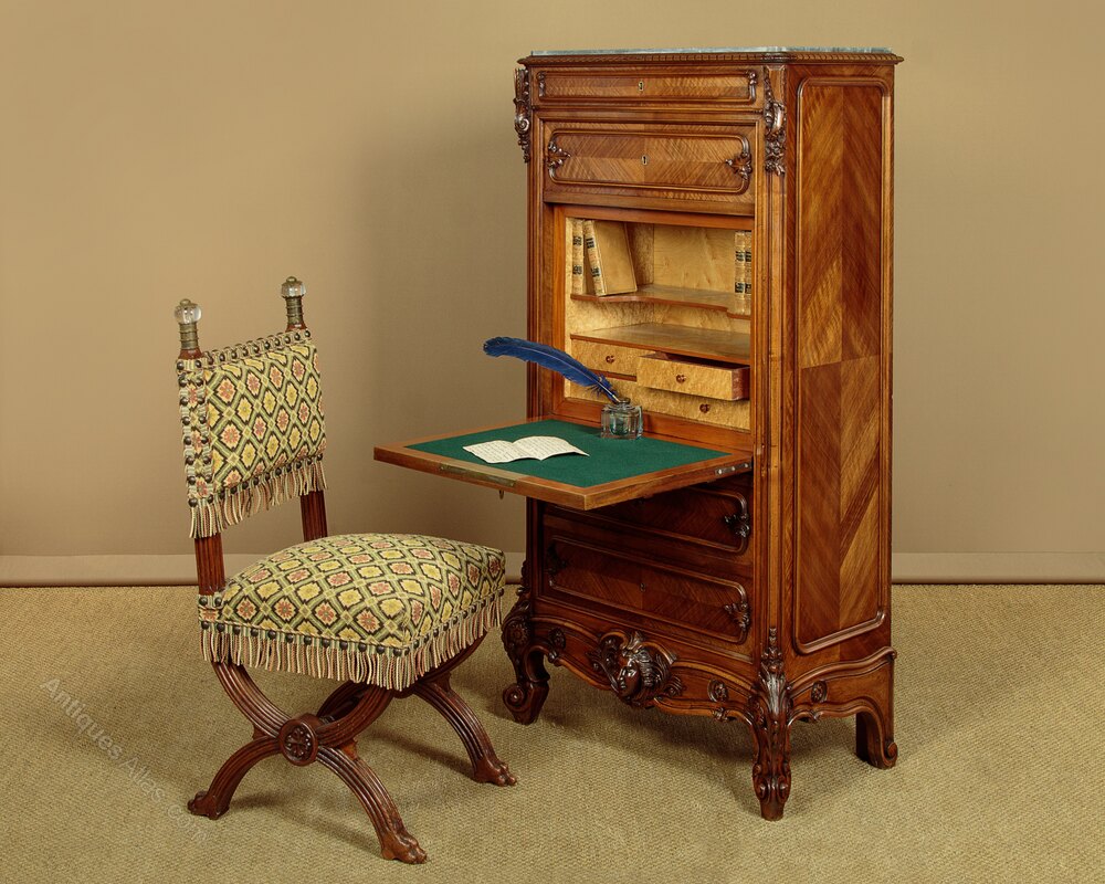 Quality late 19th.c. walnut secretaire abattant or bureau with drawers c.1880. Useful narrow dimensions, just 29½" wide. Original grey marble top over four working drawers and a fall front bureau which opens to form a 23" x 20" desk with a green baize work surface. Very attractive interior with sparkling birch burr veneers featuring shelves and three mahogany lined drawers. Decorative exterior with symmetrically arranged walnut veneers and crisp acanthus carved detail to the drawer fronts. Flanked with unusual carved detail to the shoulders. Shaped and carved apron and legs with a carved female head at the centre. Mahogany drawer linings and walnut back panels. Excellent colour and condition, cleaned and waxed in our workshops. Keys supplied for the desk and drawers.