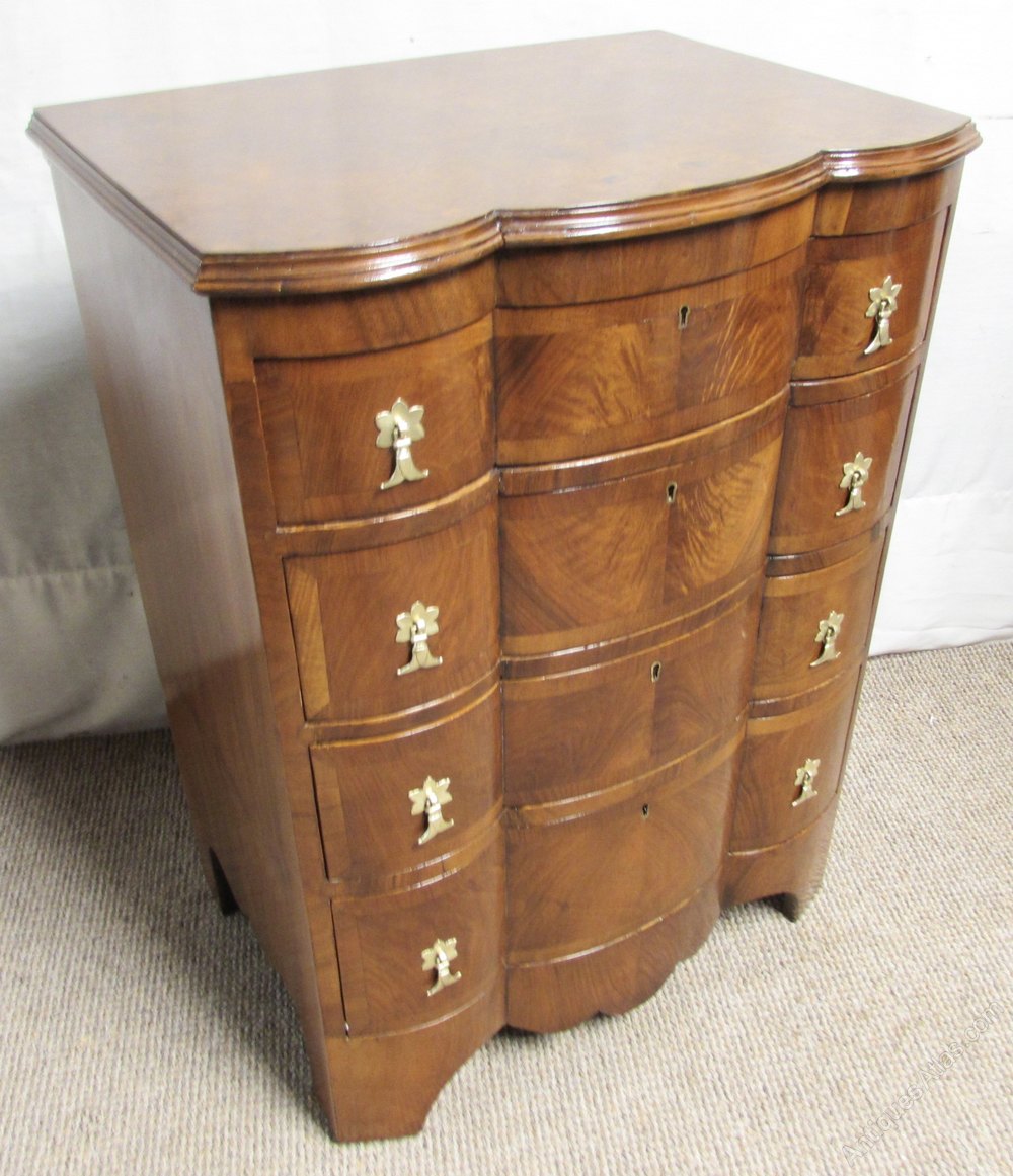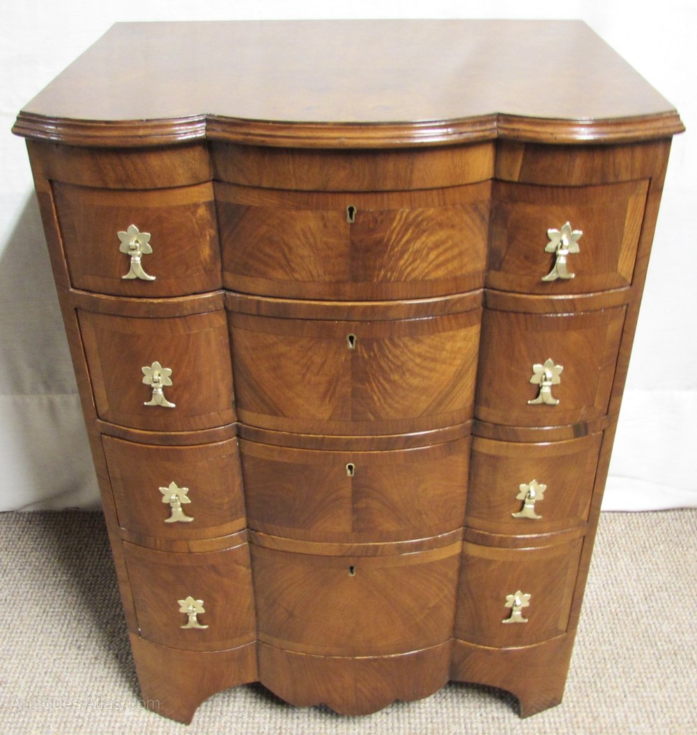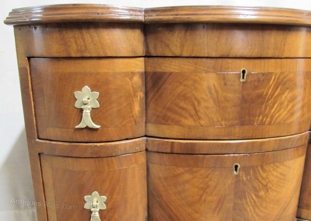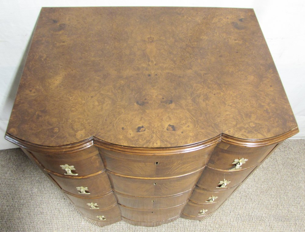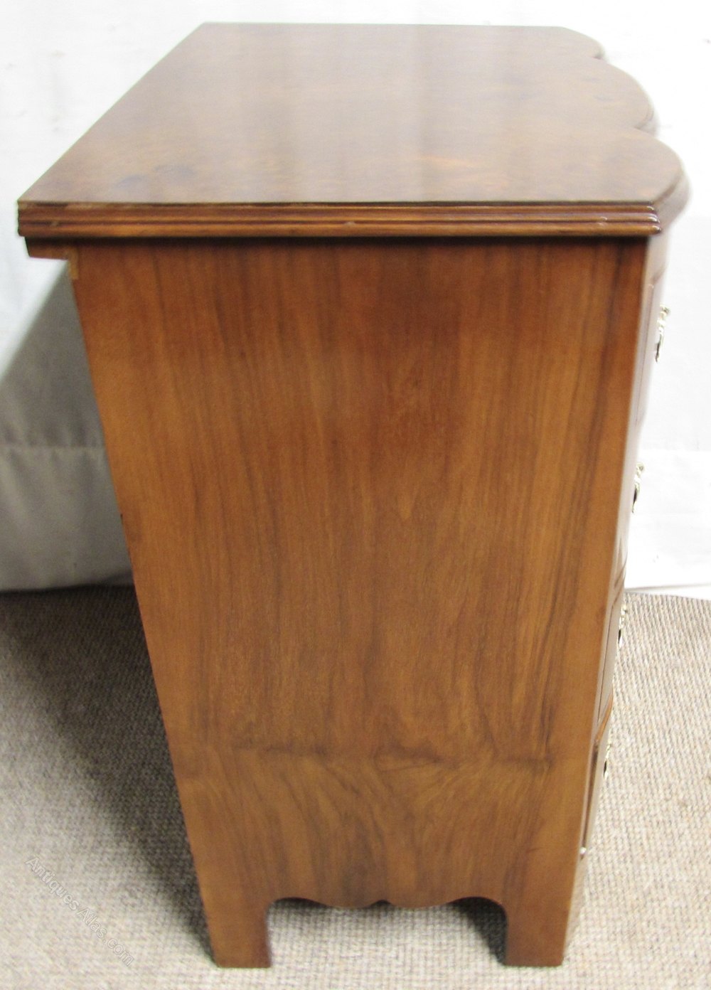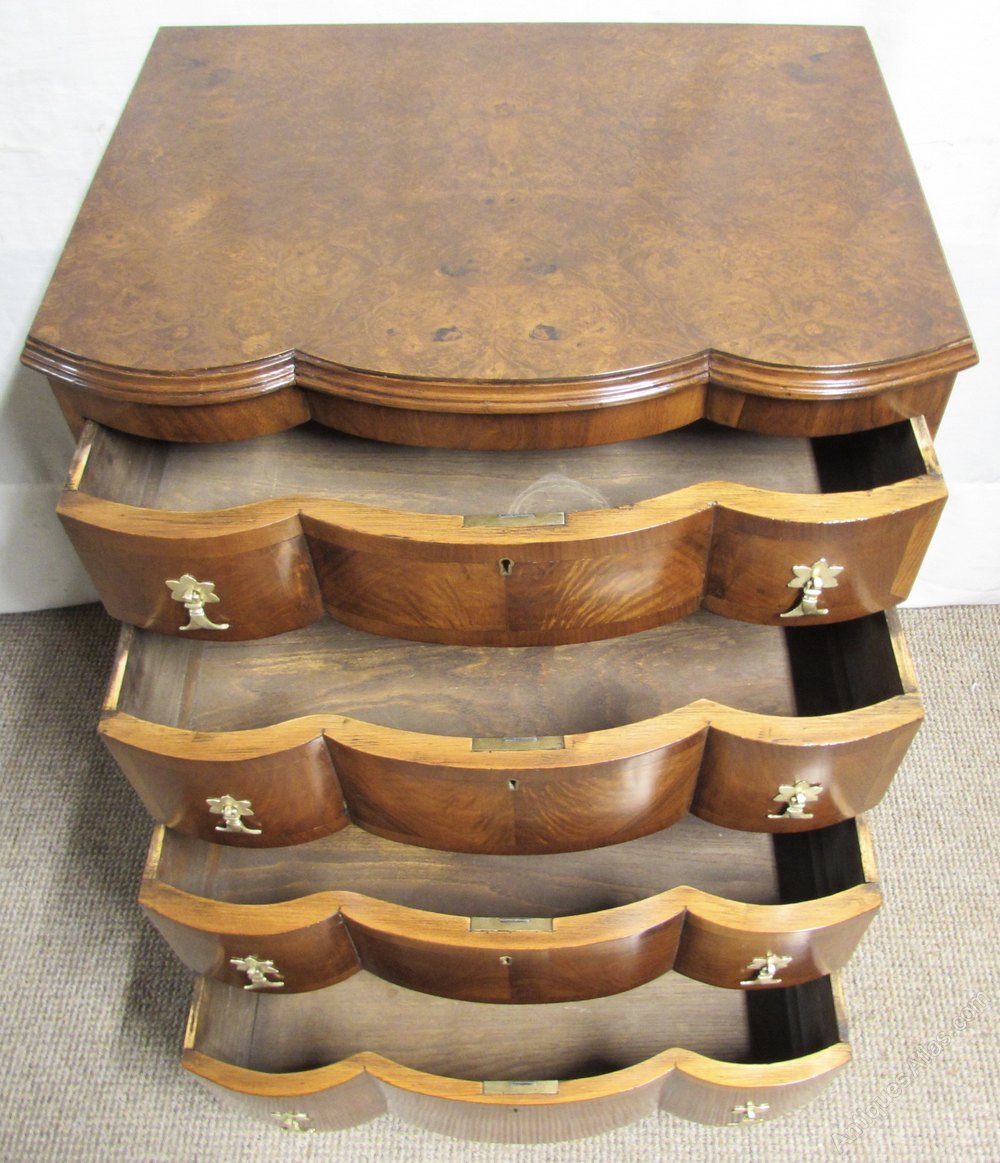 A delightful Chest of Drawers having a wonderful shaped front. The 4 drawers all run smoothly and fitted with original lovely brass drop handles. The top is Burr Walnut and the drawers are cross banded. Of very good quality having solid Oak drawers with excellent dovetails. A little older than some dating to the late Victorian period.