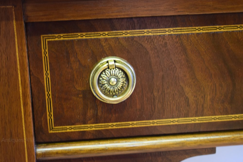 Dating from the 1920's with stunning walnut veneers. Standing on square tapered legs with a polished top over 2 drawers fitted with these brass ring pull handles, box wood stringing to the top, and drawer-fronts having this wonderful inlaid.