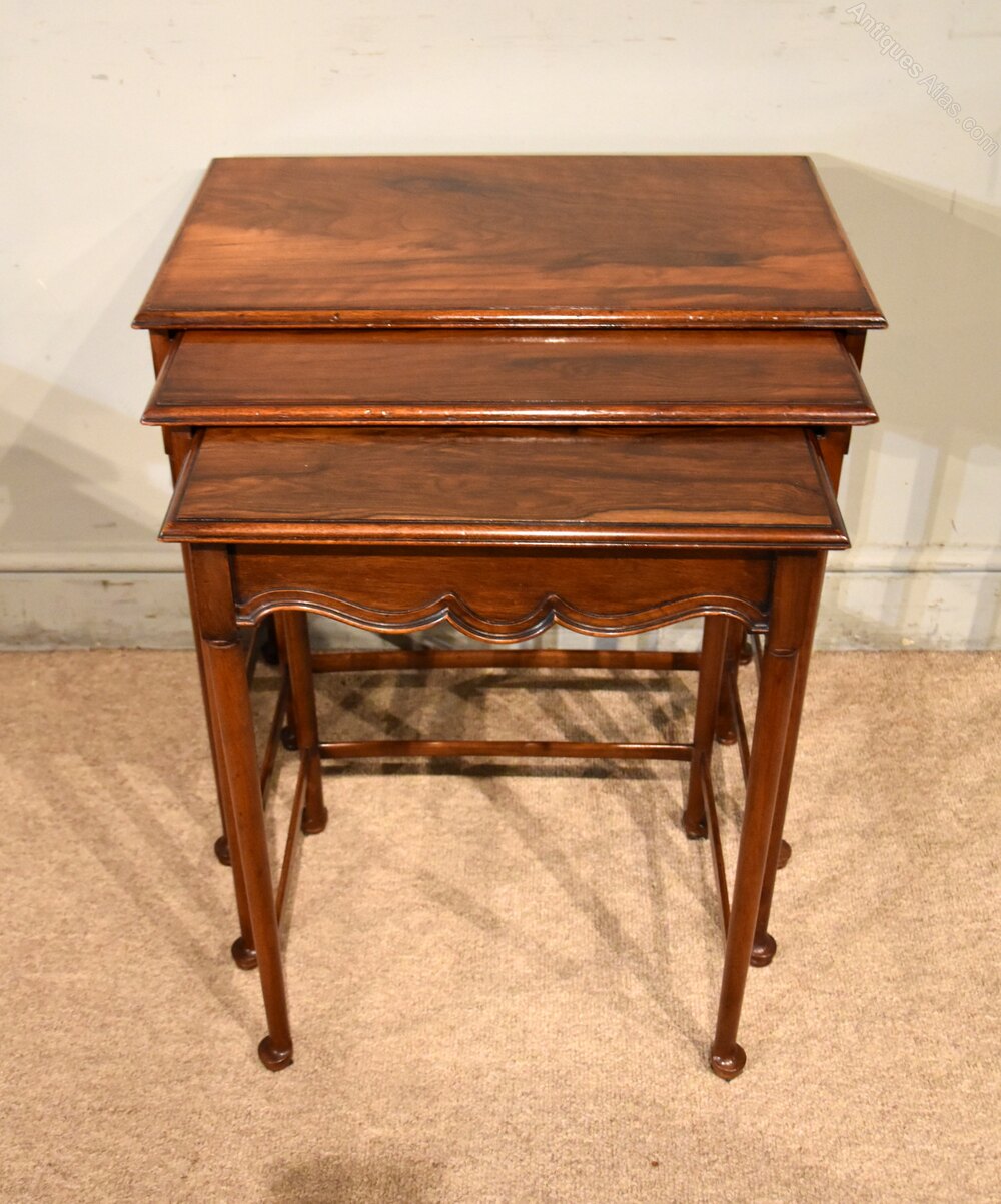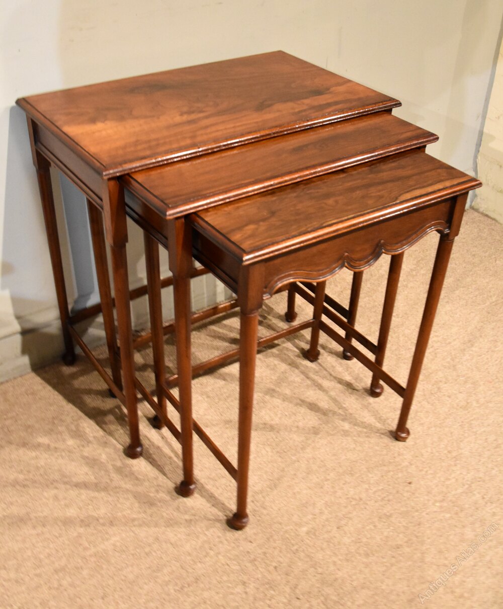 Waring & Gillow circassian walnut nest of antique tables with Waring and Gillow label and factory impress number. In original condition