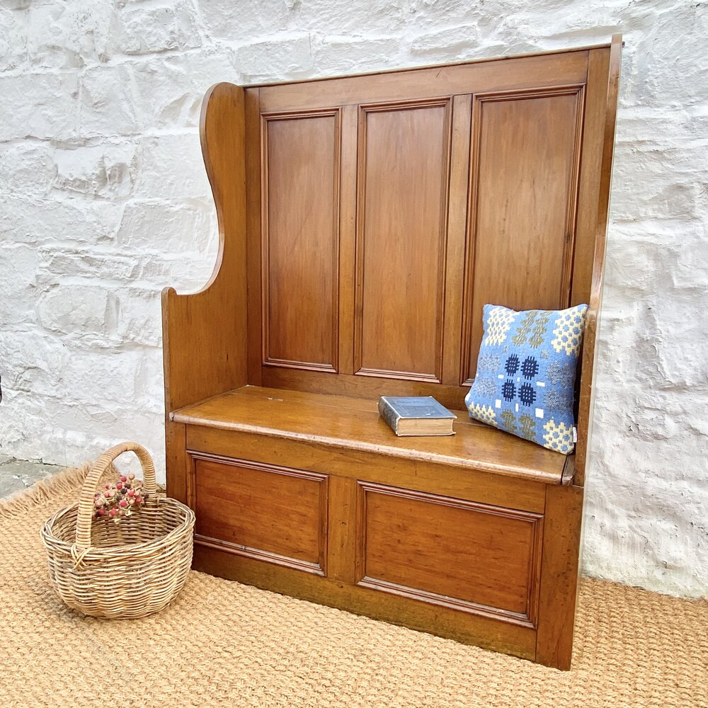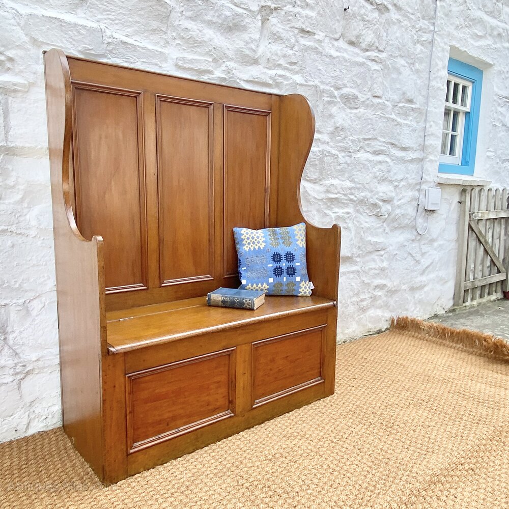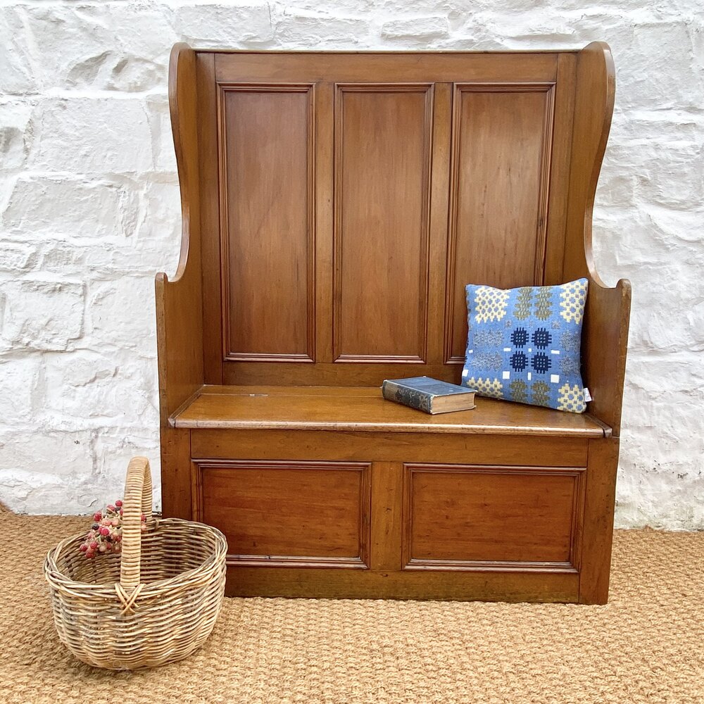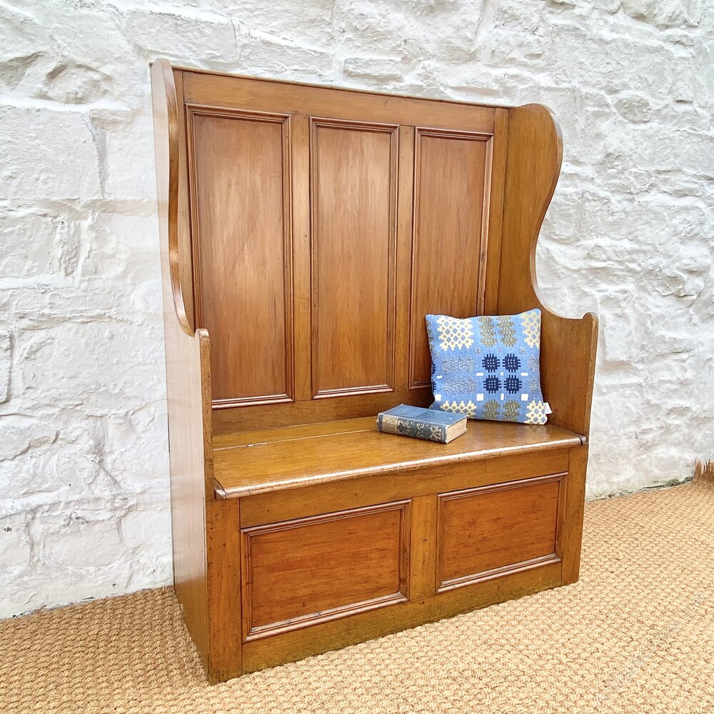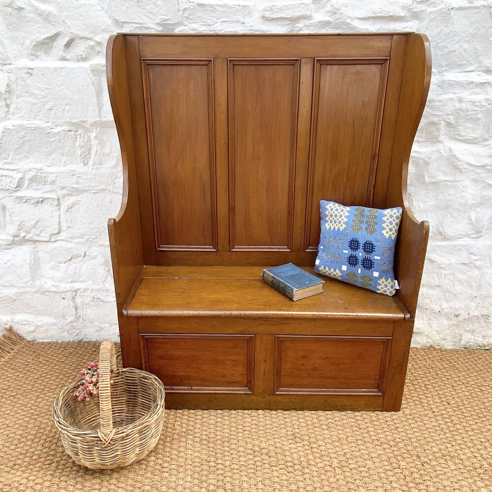A beautiful little Welsh Fruitwood and Sycamore Box Settle of the most desirable and rare traditional winged form and highly sought after small size - Teifi Valley c1800