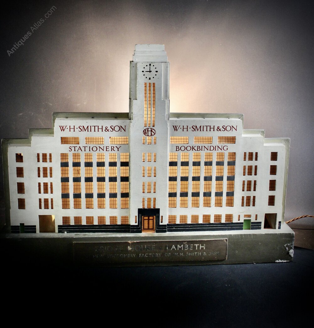 An architectural model of the W.H Smith building, Bridge House", designed by Herbert O Ellis & Clarke and architect to W.H Smith , F.C Bayliss. From the archives of W.H Smith this is a rare one off example. Finished front and back , the base applied with a painted plaque "Bridge House. Lambeth. The New Stationary Factory of W.H Smith & Son" Opened in 1935 "Bridge House" which stood on the Albert Embankment S.E,1 . Despite being regarded as one of the best example of interwar factory buildings to have been built in London it was demolished in the 1970's without resistance and largely been forgotten about. The base of the model is fitted with a lighting tube and the antique clock tower with a single light bulb holder which the new owner could have re-instated. I have taken a photo with a lighted bar drop to get the idea of how it would look illuminated. Measures 51 cm high x 69 cm wide x 13 cm deep