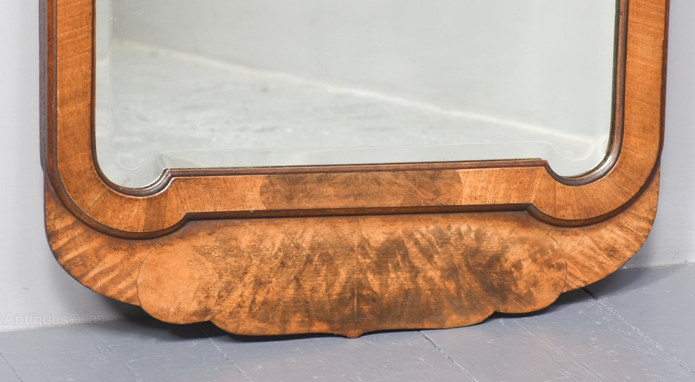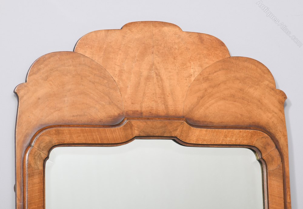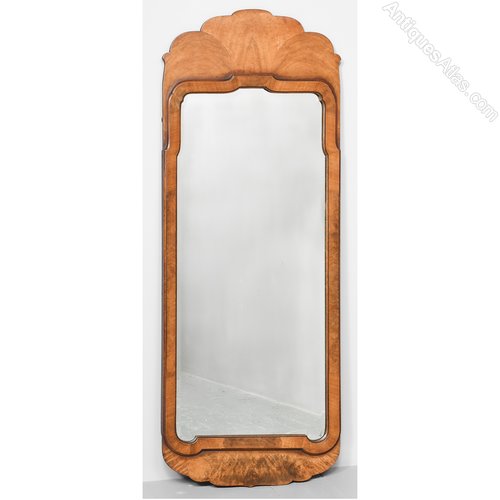 Circa 1920’s A Queen Ann style mirror by ‘Whytock and Reid of Edinburgh’, from a design by’ Sir Robert Lorimer’ shaped walnut frame with bevel ledged edge mirror following the same form, the bottom of the frame has an elegant burr walnut panel with mirror matched veneers.