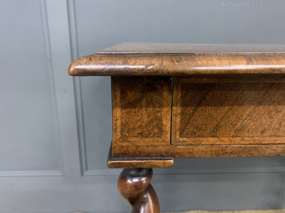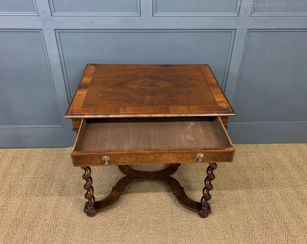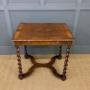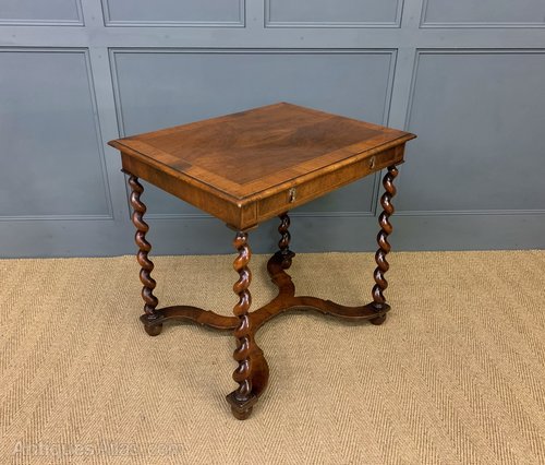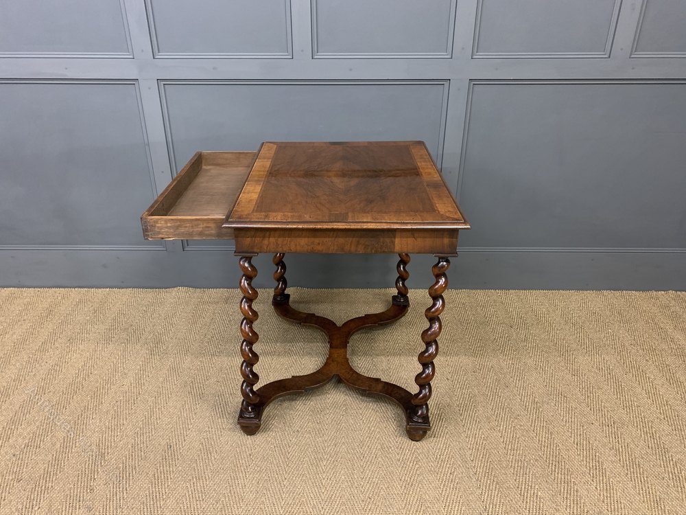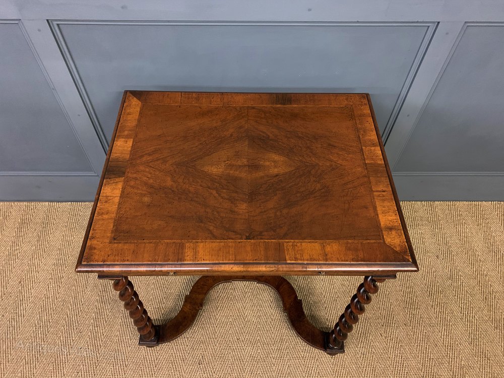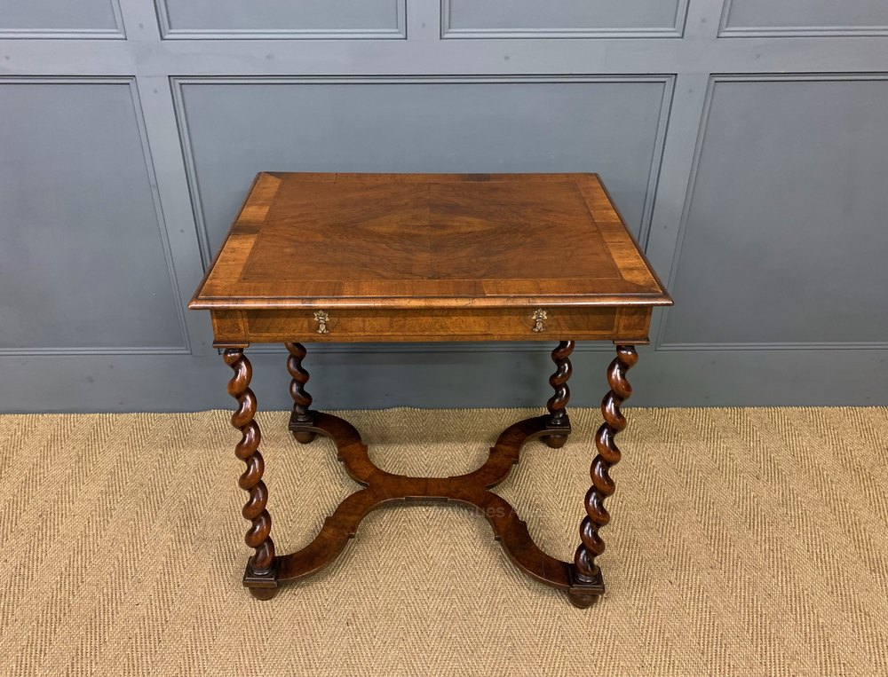 A charming 19th century burr walnut lamp, or side, table in the William and Mary style. Of very good construction in solid walnut with attractive burr walnut veneers onto an oak carcas. The rectangular top is cross banded and inset with feather and dart inlay. This inlay continues to the drawer front. With a single drawer to the freeze fitted with its original solid brass drop handles. All standing on splendid barley twist legs , terminating in bun feet and united by a wavy form x frame under stretcher. Sympathetically refinished in our workshops and now offered for sale in excellent condition with a warm colour and patina, ready to go straight into the home.