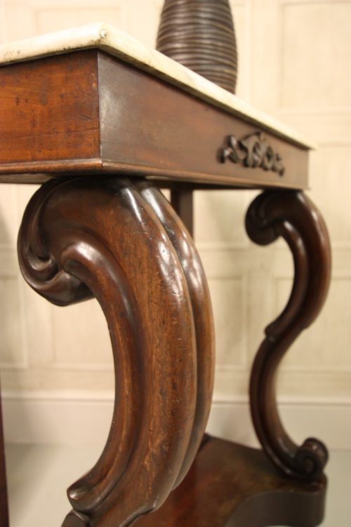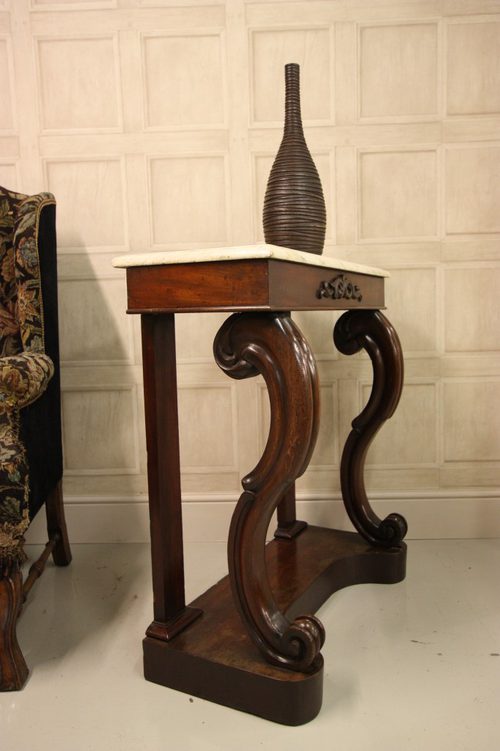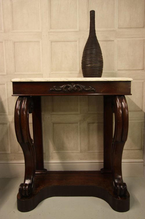 A decorative antique mahogany console table, now available to view in our panelled room in our Clitheroe antiques showroom. DimensionsHeight 91.5cm (36.02") Width 83cm (32.68") Depth 42cm (16.54") Category Antique Furniture Period William IV Antiques Material Mahogany Condition Very good Item code as111a2487 / C633A Status Sold