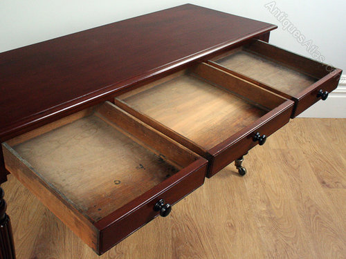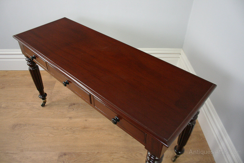 This is an attractive and superb quality antique William IV mahogany console side table, circa 1830 – 1840. The table features a stunning rich mahogany colour formed from a single piece of mahogany with a moulded edge. Below, sits three working drawers, which feature scribe mouldings and the original ebony turned knobs to the drawer fronts. The drawers also feature mahogany drawer linings, which have been hand dovetailed. The table sits on four stunning tapering fluted legs which terminate on the original brass studded collars and brass castors. This table is a truly classic design from the William IV period. All in all, this is a very pretty and superb quality table.