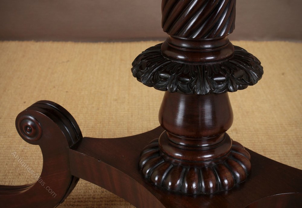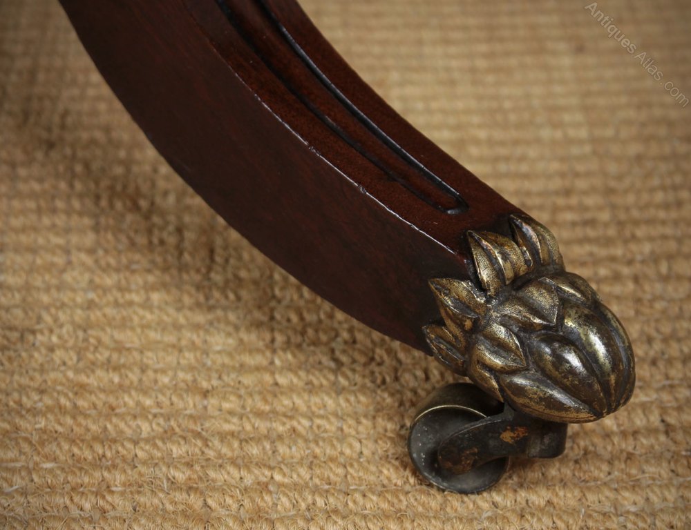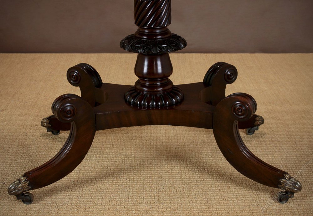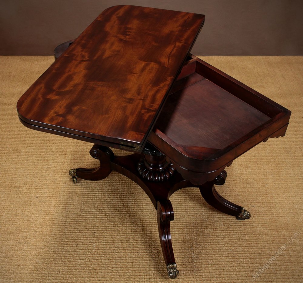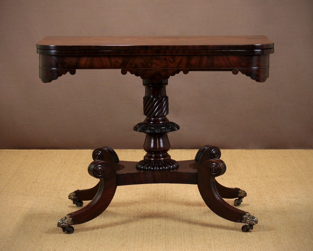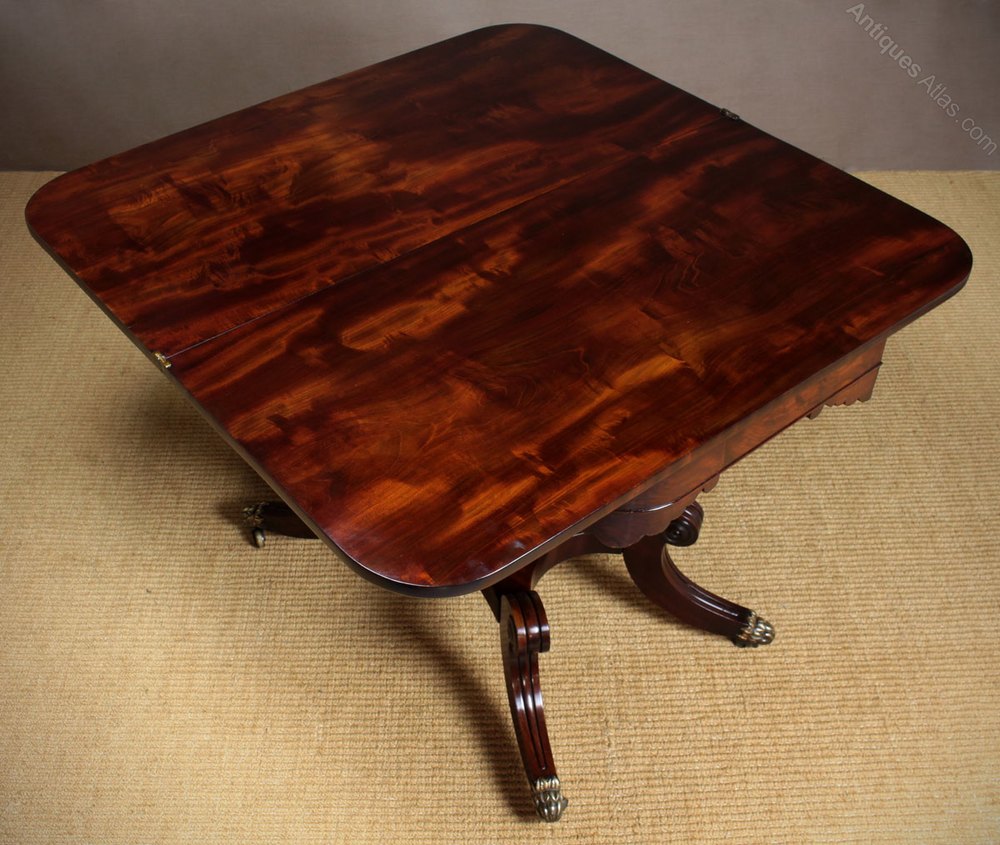 Good looking William IV mahogany fold over tea table c.1830. Sits flat against a wall as an elegant side or console table or twist and fold open the top to make a useful square supper table for four. Excellent flame mahogany veneered top on a turned and carved pedestal raised on a shaped plinth with carved sabre legs ending in original gilded brass claw feet and castors. Excellent colour and condition, cleaned and polished in our workshops.