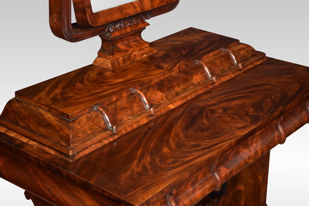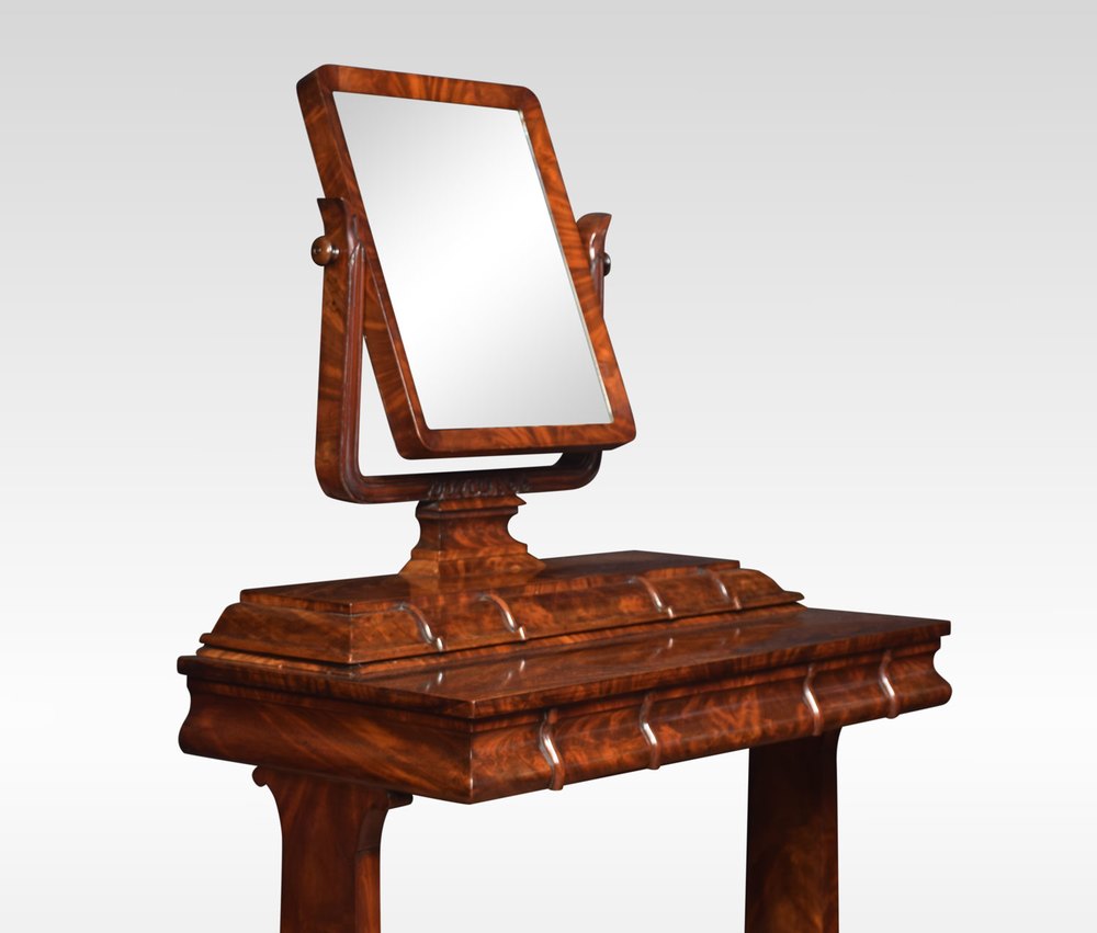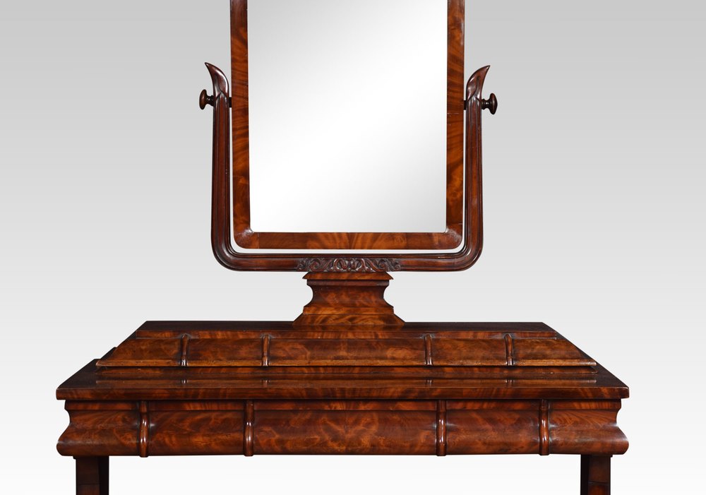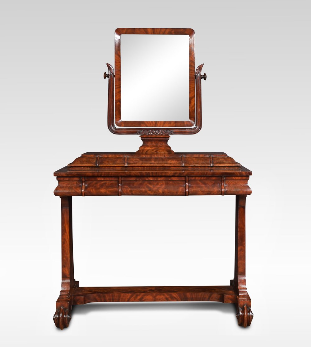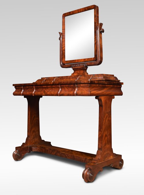 William IV mahogany dressing table, The rectangular adjustable mirror above ogee fronted drawers. The well figured top fitted with three moulded frieze drawers. Raised up on trestle ends with platform stretcher. Terminating in scroll feet.