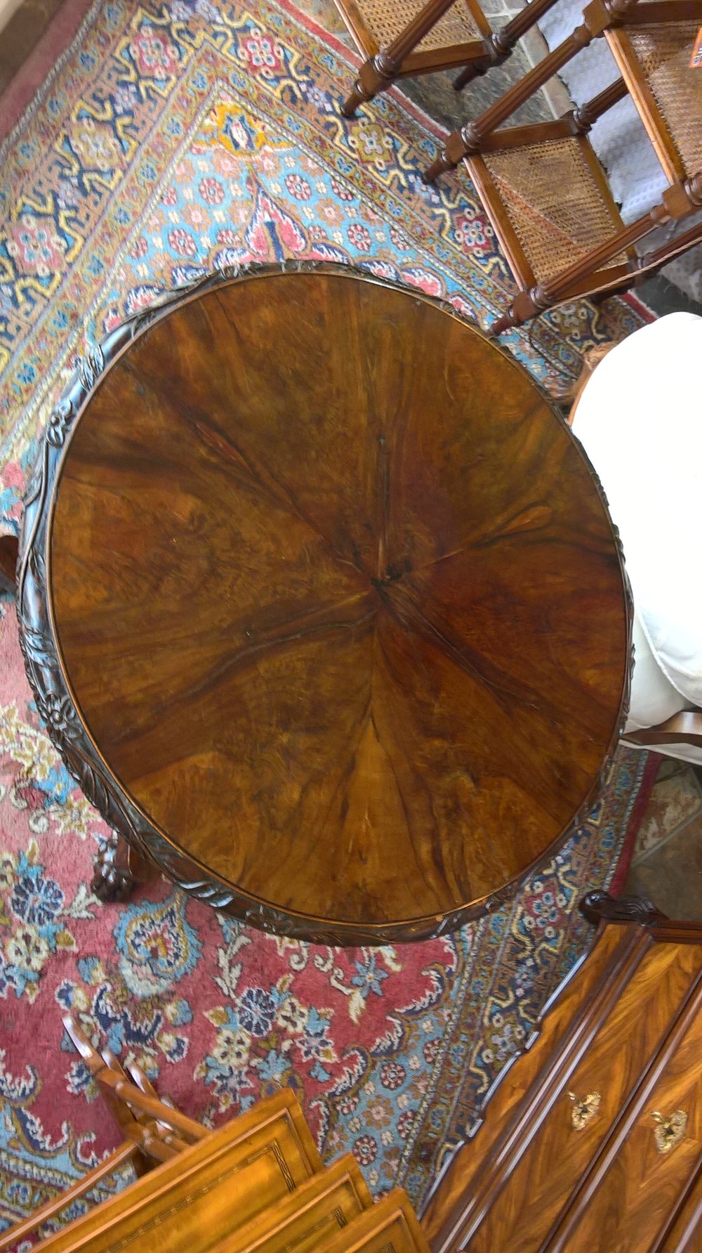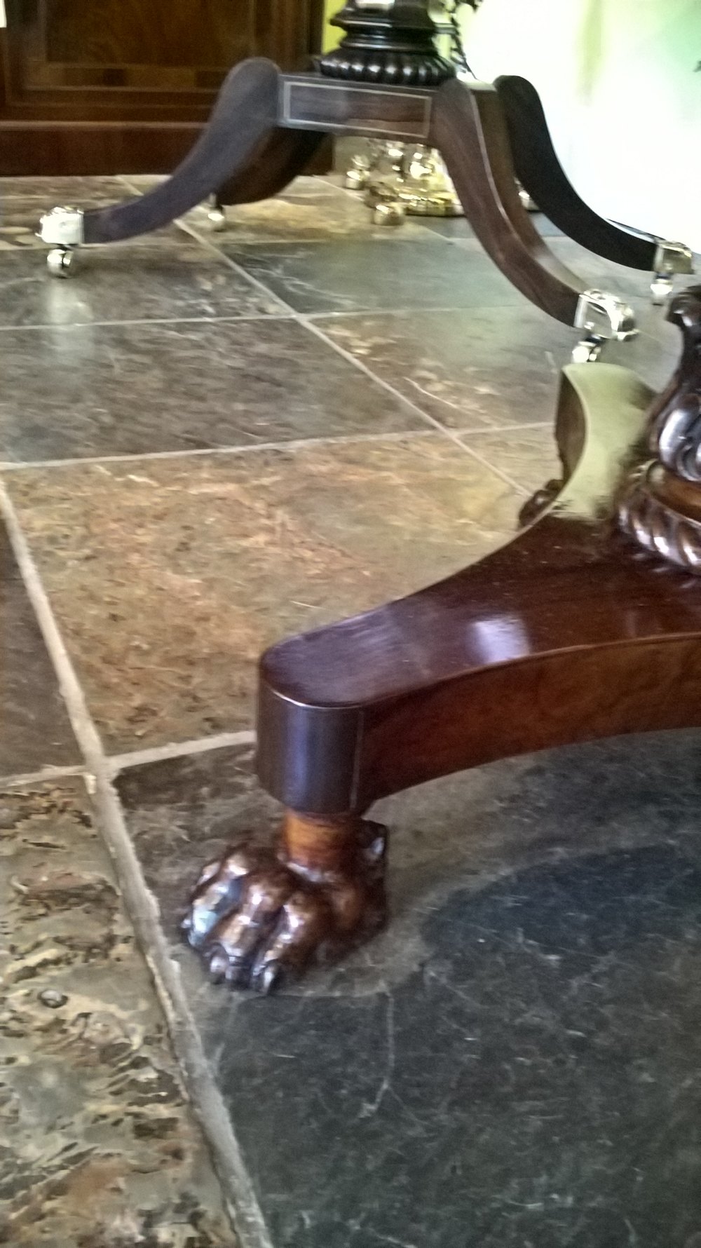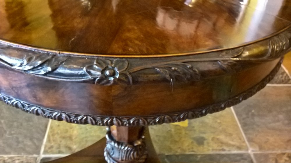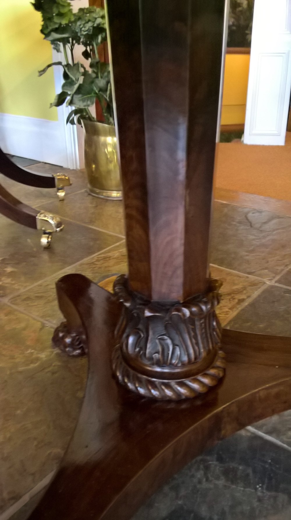 A William IV mahogany occasional centre table, with circular top with carved edge and with four frieze drawers all supported by a faceted column with triform base and short paw feet. Diameter 26" x 28"h
