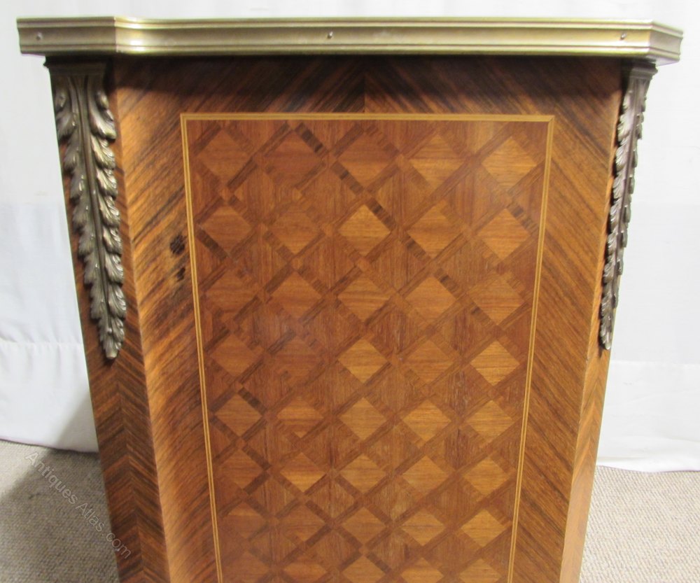 An extremely fine quality French Commode or Chest of Drawers. Made from Kingwood with 3 smoothly running drawers fitted with original handles. The ormolu mounts that adorn the piece are very fine quality and crisp. The top, front and sides are parquetry panels, the top has a brass edge and perhaps the best feature is the amazing shape, the front is swept in a serpentine form and the sides also. The drawers are made from solid oak with very good dovetails. This Chest is of the finest quality from the period and comes in excellent condition for the home.