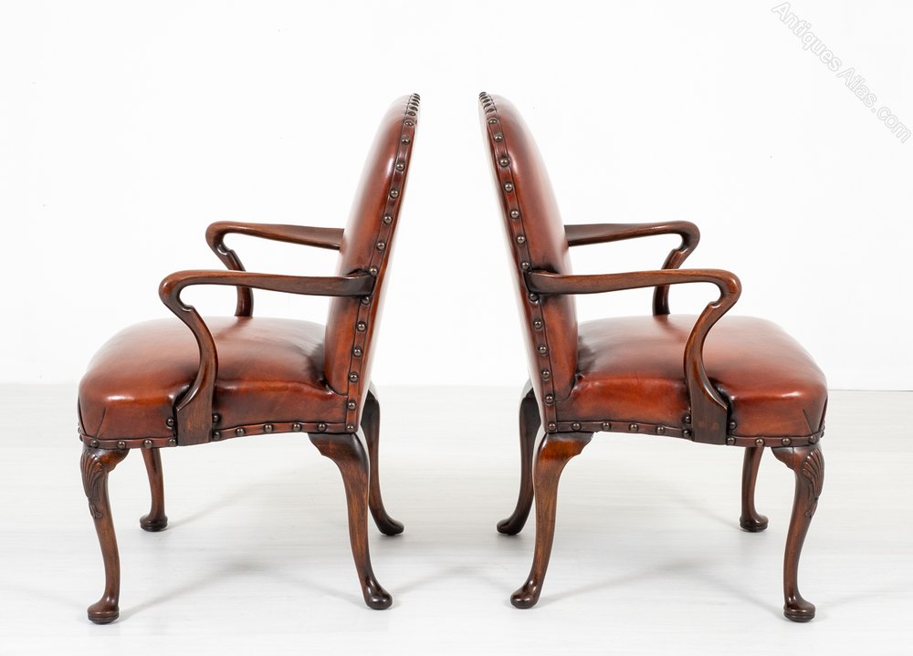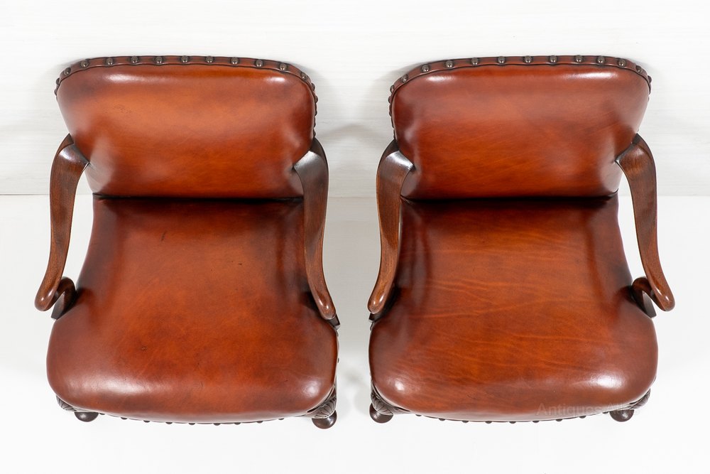 This Beautiful Pair of Queen Anne Walnut and Leather Armchairs feature hand dyed leather to the Seats, Backs and Rear of the Chairs finished with traditional Brass Stud Work