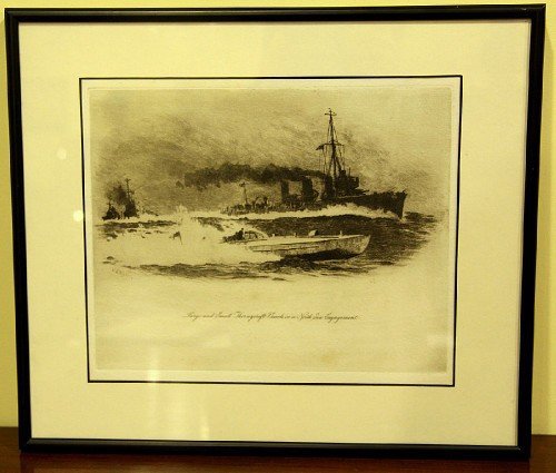 An Etching of Large and Small Thonycroft Vessels in a North Sea Engagement Circa 1915 by W L Wyllie (R.A.)