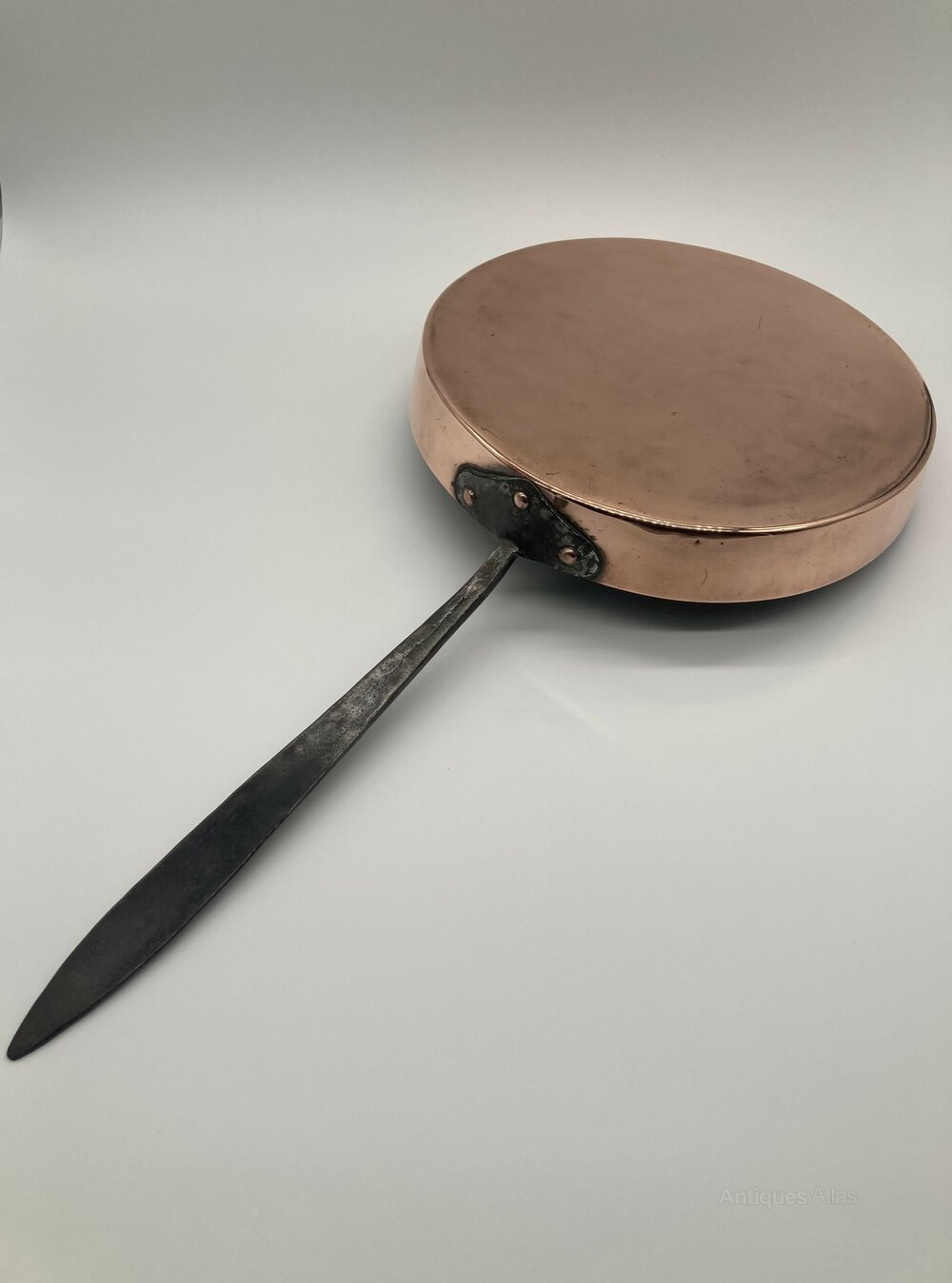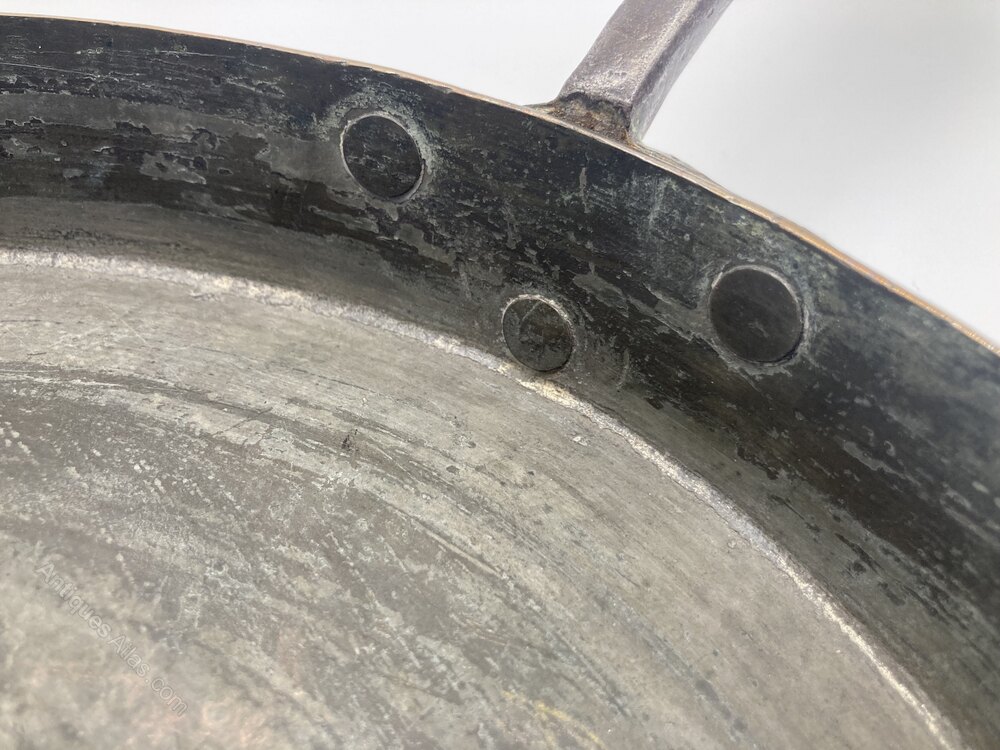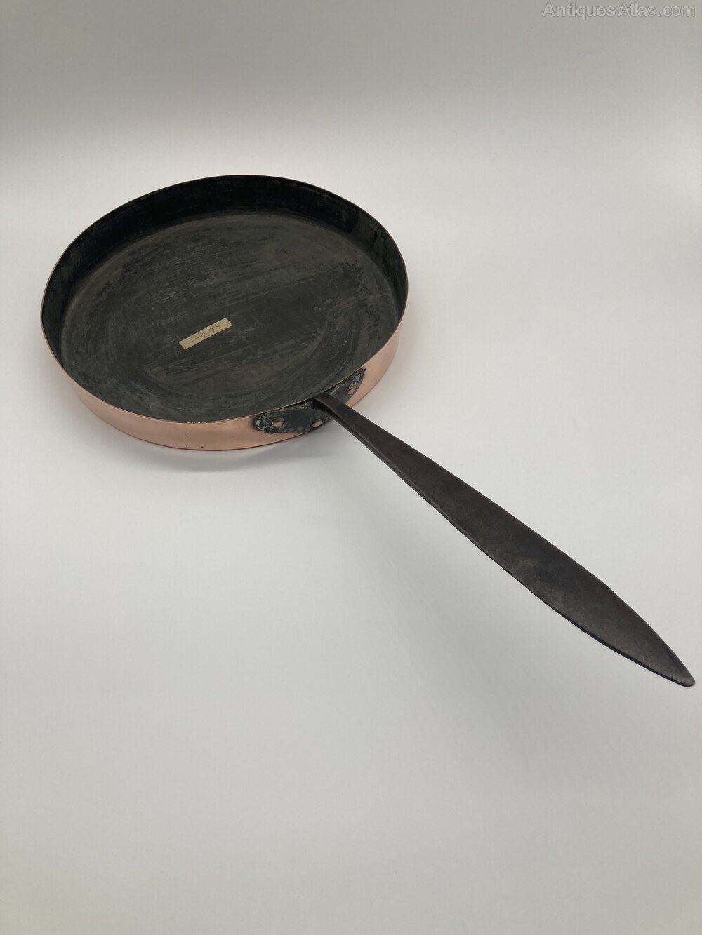 A mid 19th Century copper frying pan with long iron handleDateMid 19th Century :
