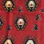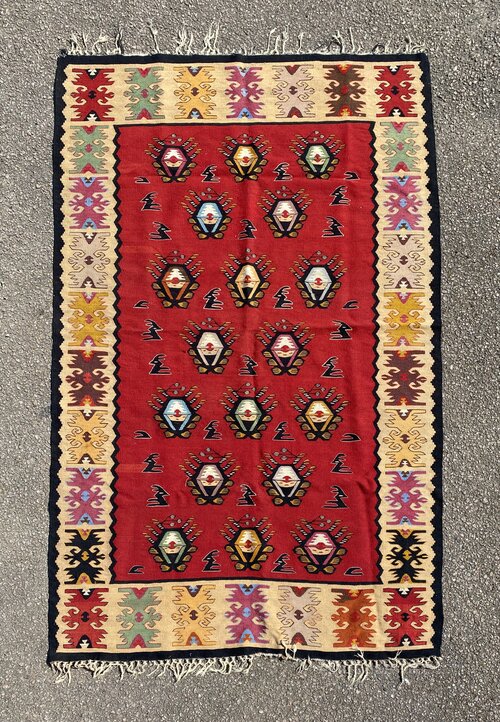 A striking Anatolian Kilim rug, handwoven in wool, circa mid-20th century. The rich red field is filled with a series of hooked diamond medallions, framed by a wide ivory-toned border with multicoloured stylised motifs.The piece demonstrates the traditional artistry of Anatolian weavers, combining bold colour with symbolic tribal patterns. Kilims such as this were traditionally woven for dowries and household use, making them both decorative and culturally significant.