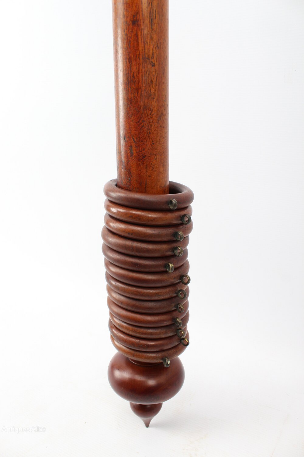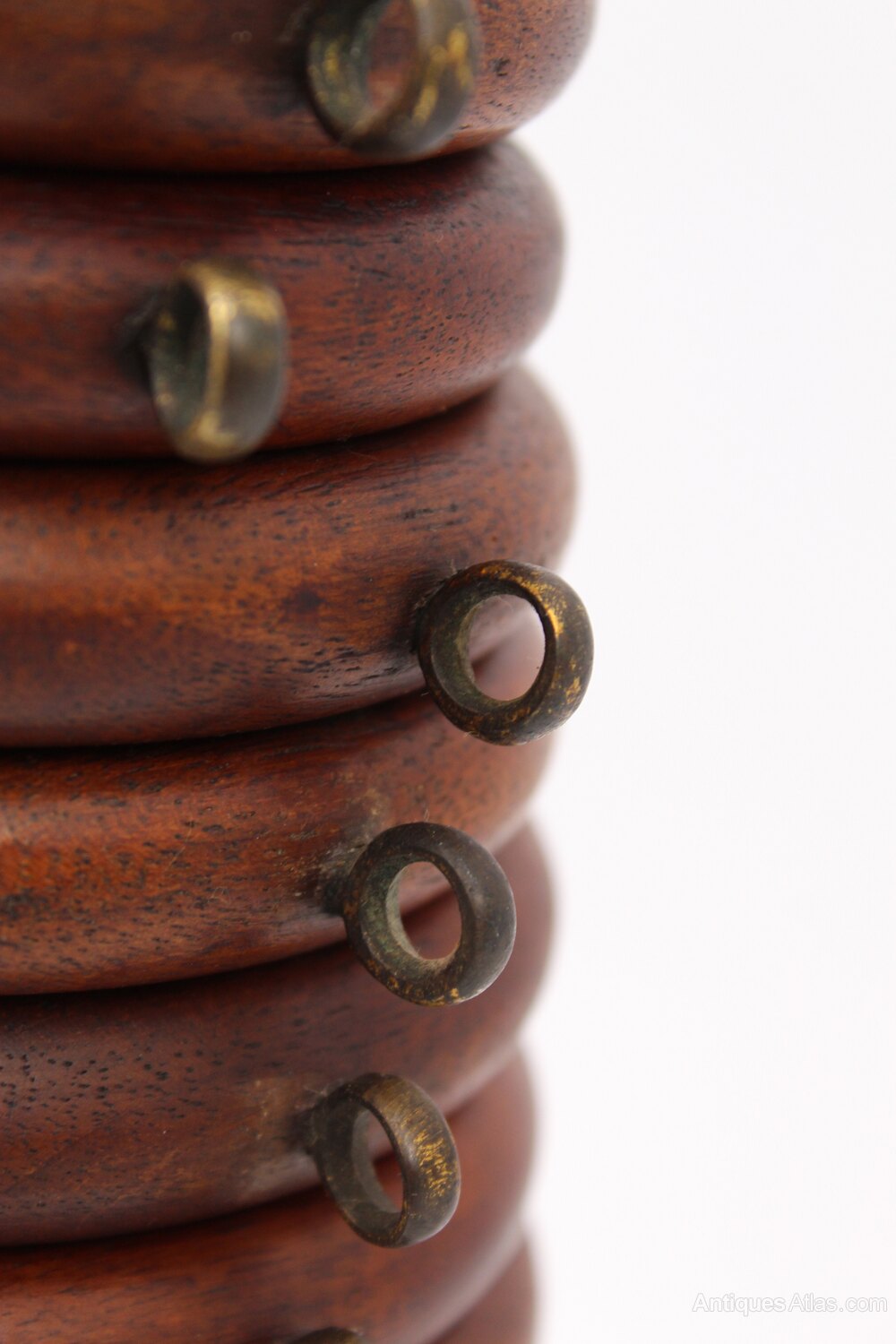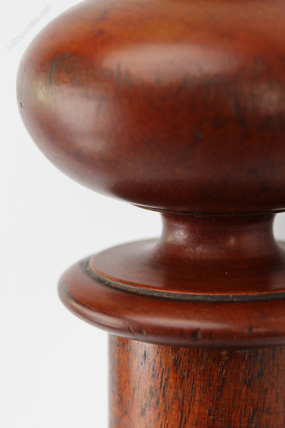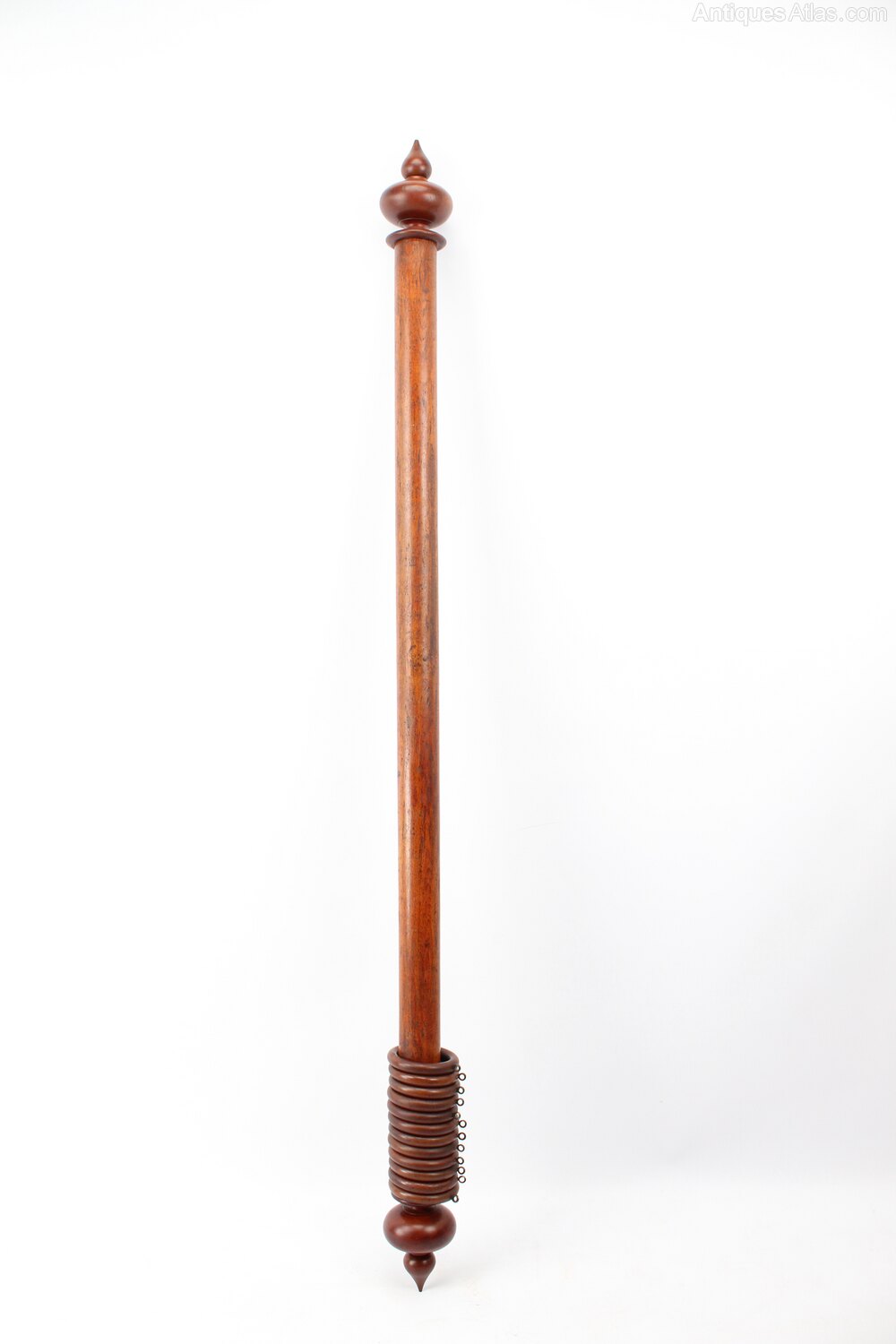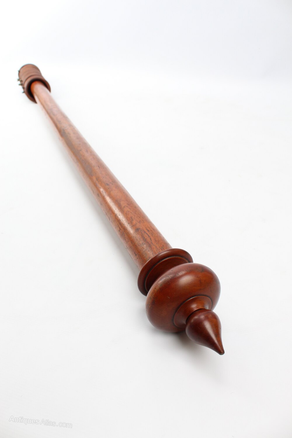 A charming antique Victorian curtain pole dating from circa 1890 measuring 162cm finial to finial. The heavy aged stained pine pole with large turned mahogany finials to either end. It has 12 period wooden rings for holding curtains.Construction/Wood:
