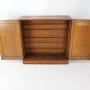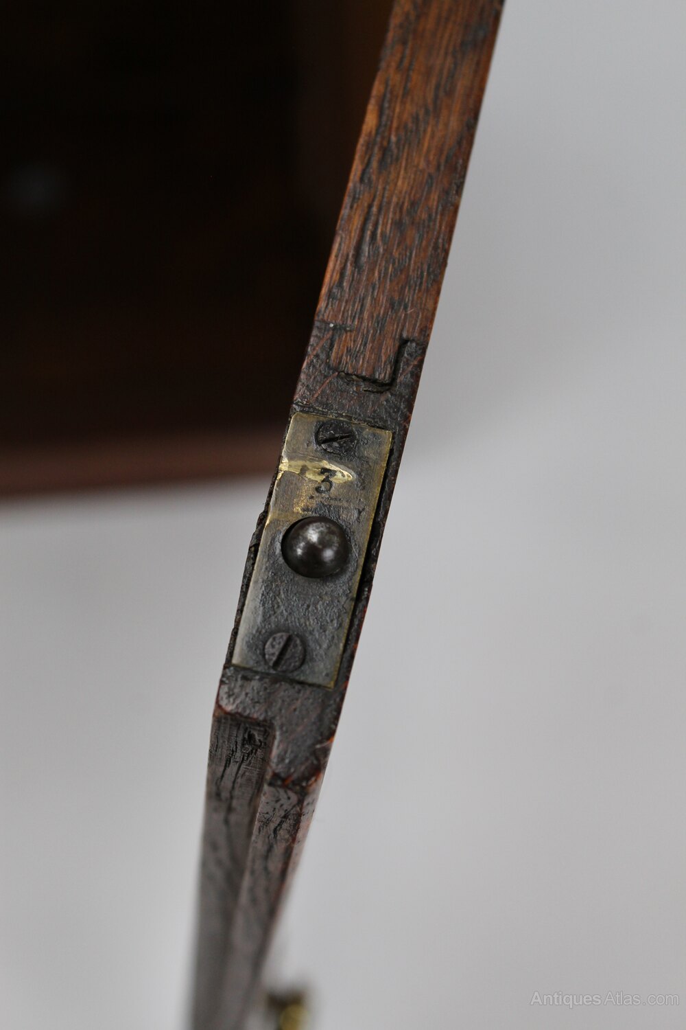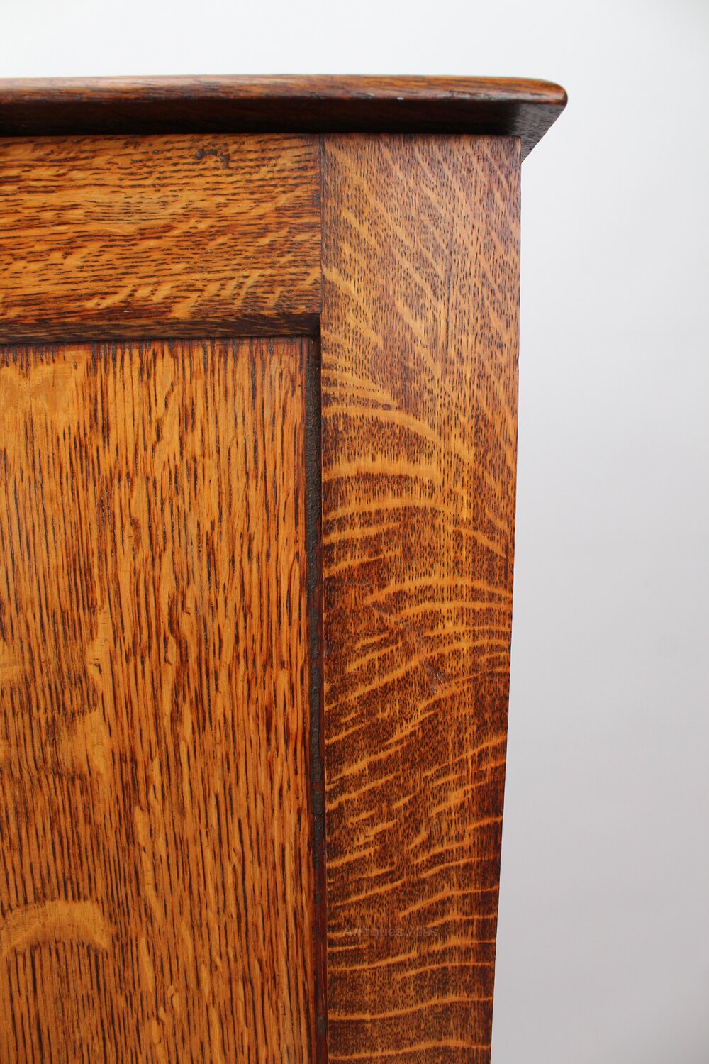 Good condition. Solid and sturdy with wear and marks commensurate with age. Some wear to the poles to the interior. Beautifully figured quarter sawn oak with a warm patina.