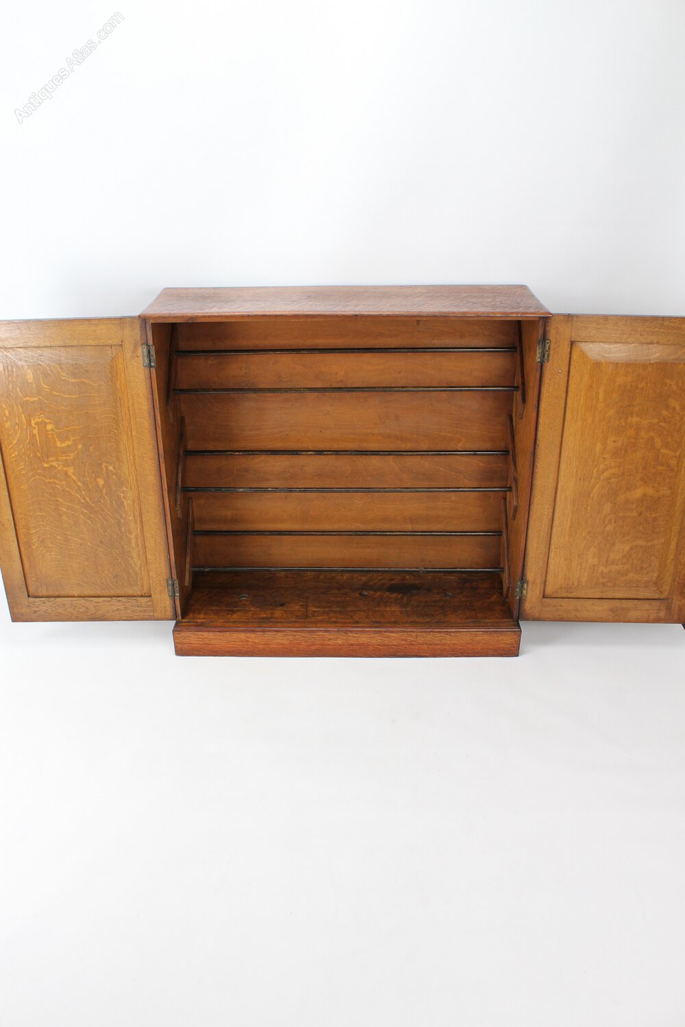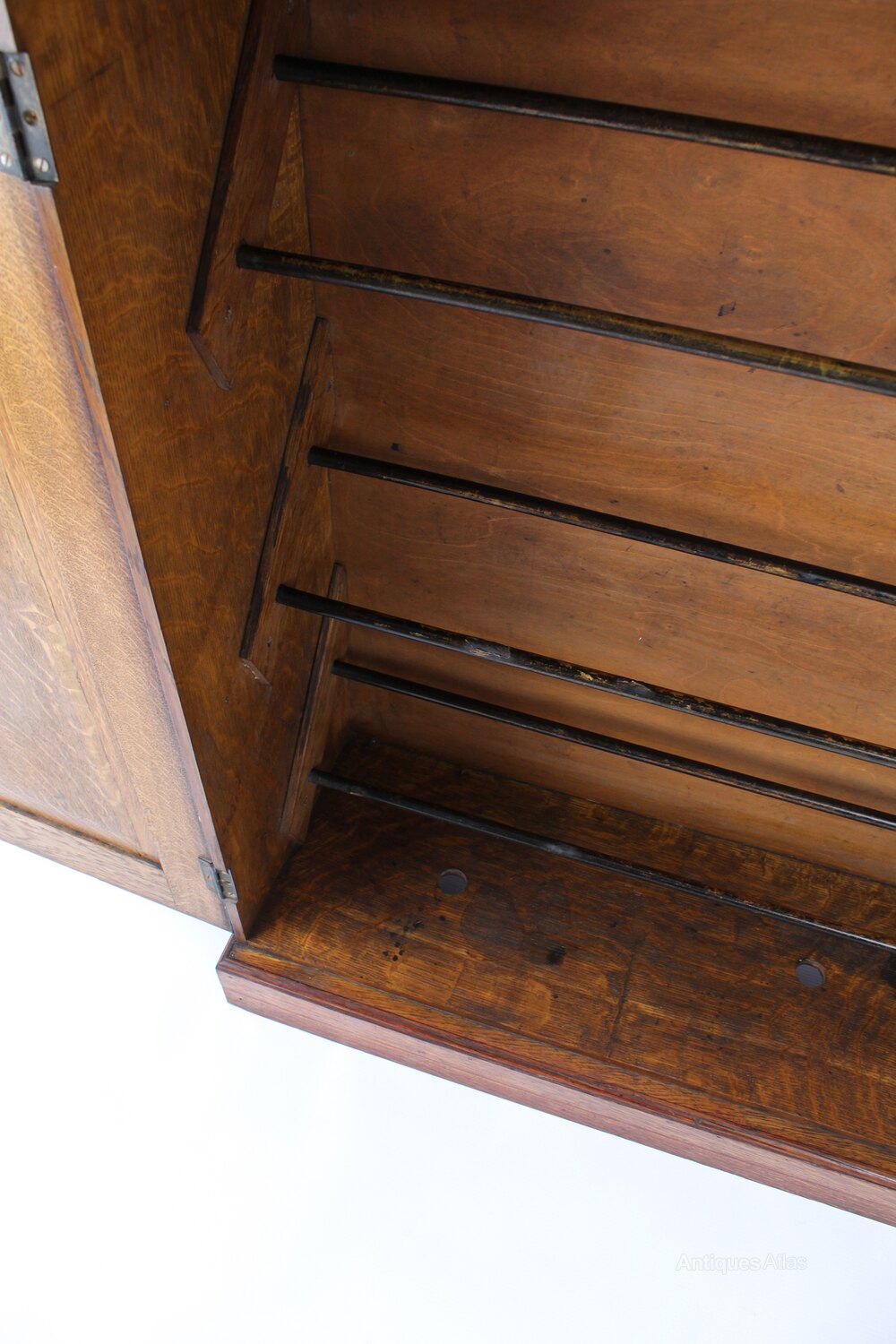 A good sized antique Edwardian oak shoe cupboard in oak dating from circa 1905. The slightly over-sailing top above two panelled doors and standing on a plinth base. It has a decorative brass drop handle to the doors which open to reveal three pairs of poles to the interior for storing shoes. In good condition with beautifully figured quarter sawn oak with a warm colour and good patina, it is of a really useful size, being slim enough to fit in a hallway or porch, while tall enough to offer lots of storage.Construction/Wood: