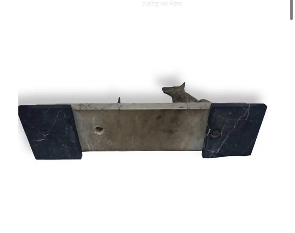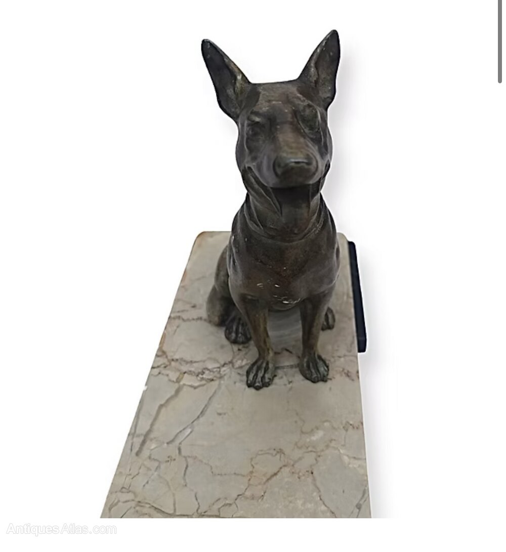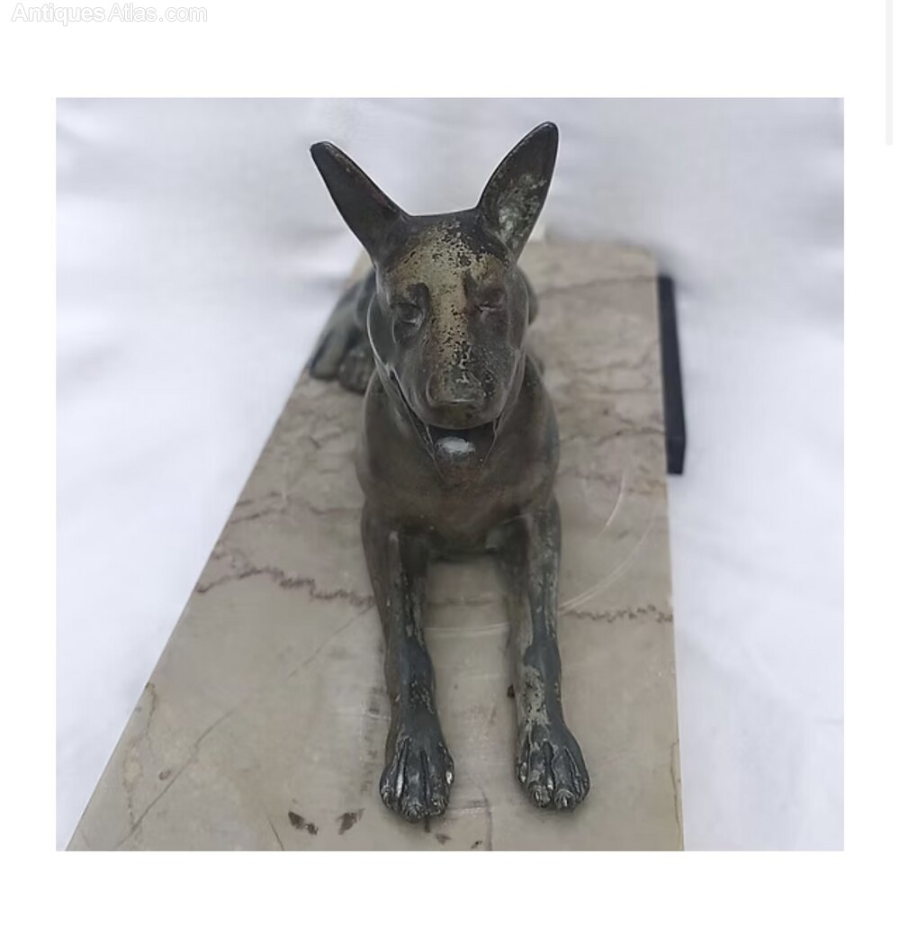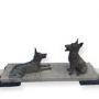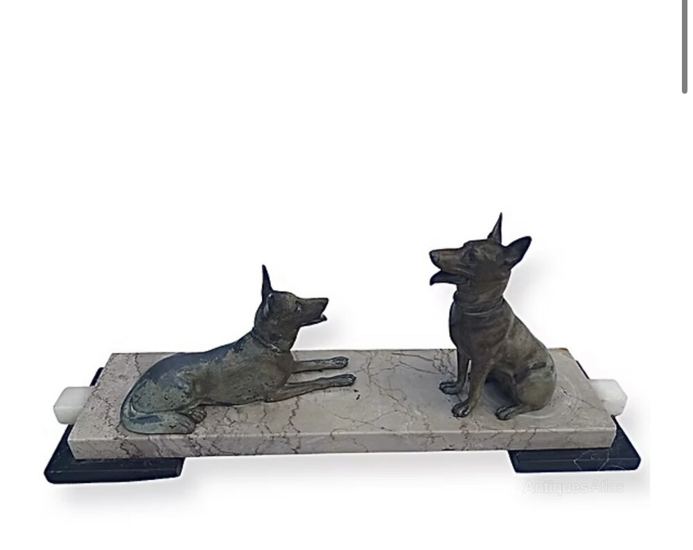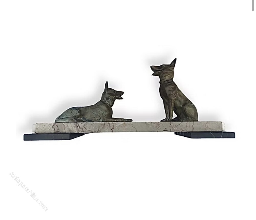 A wonderful Art Deco original decorative pair of cold painted Alsatians. Lovely details on both dogs, one seated and one laying down. These are in excellent original condition with no losses just a little wear to the finish on the Spelter. The Alsatian’s themselves measure 6” x 3” and 5” x 3.5”. The marble base is in excellent condition with no chips or cracks.and measures 15.5” x 4.5”.