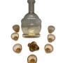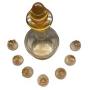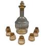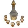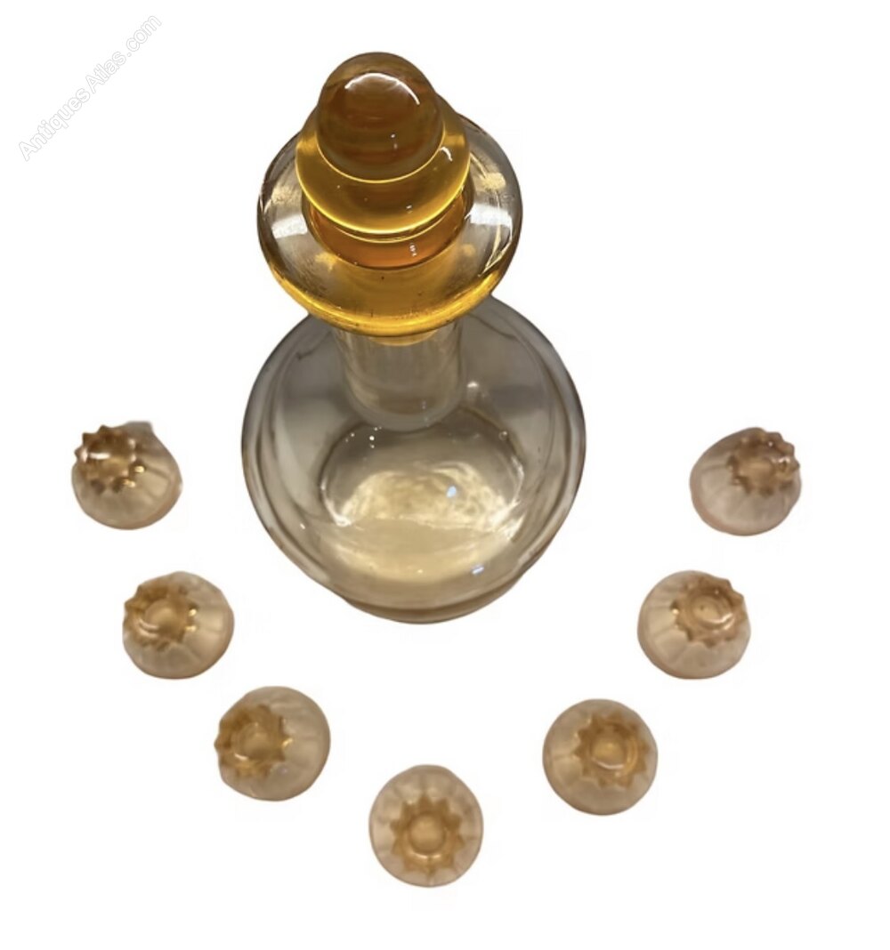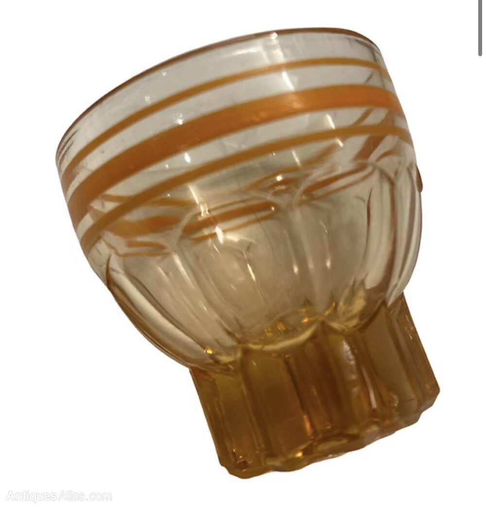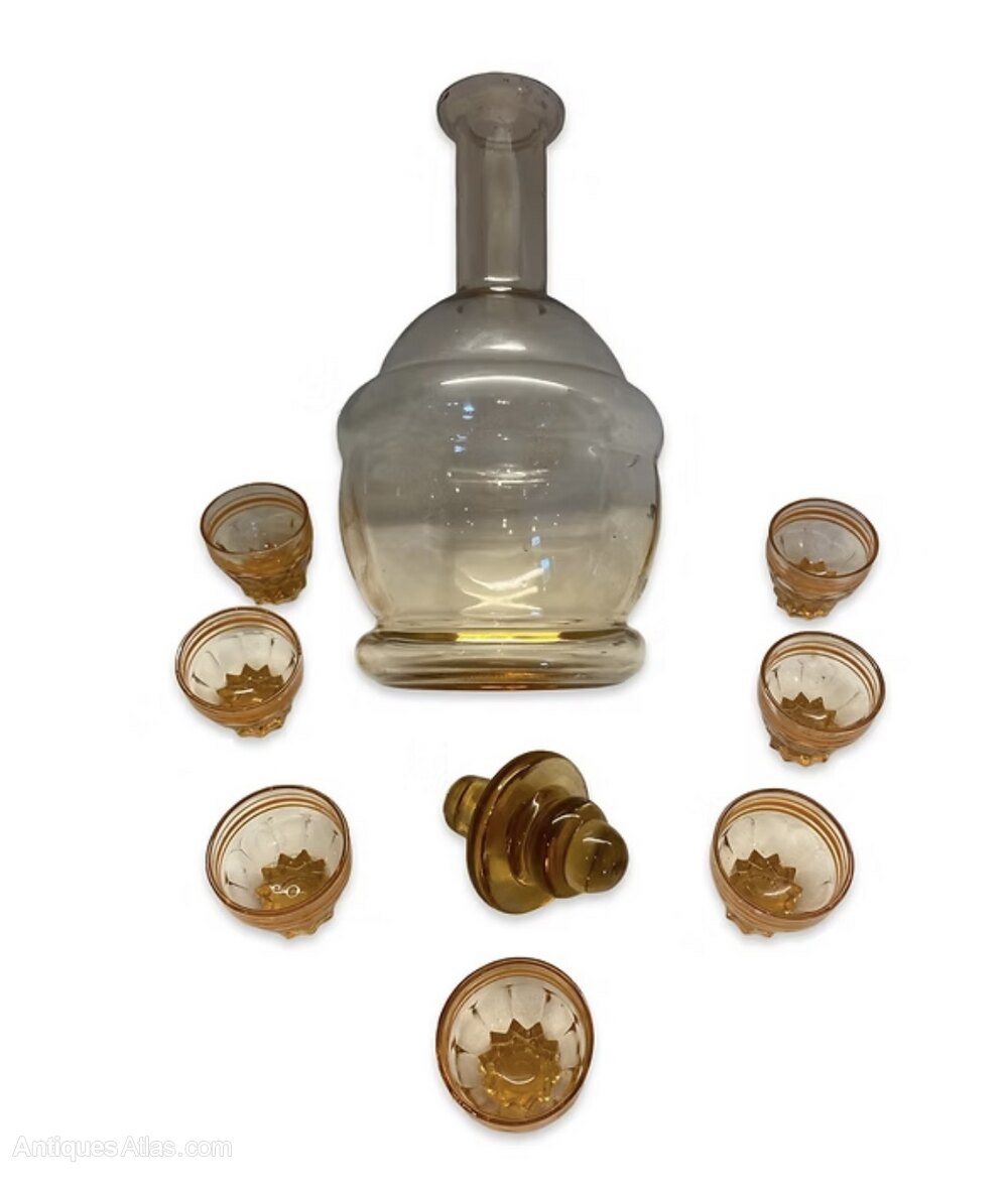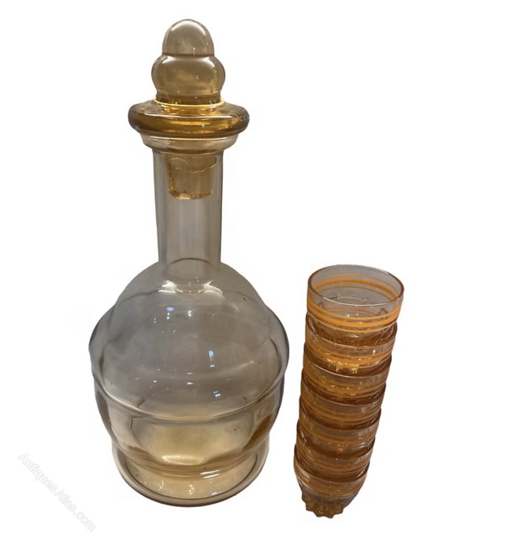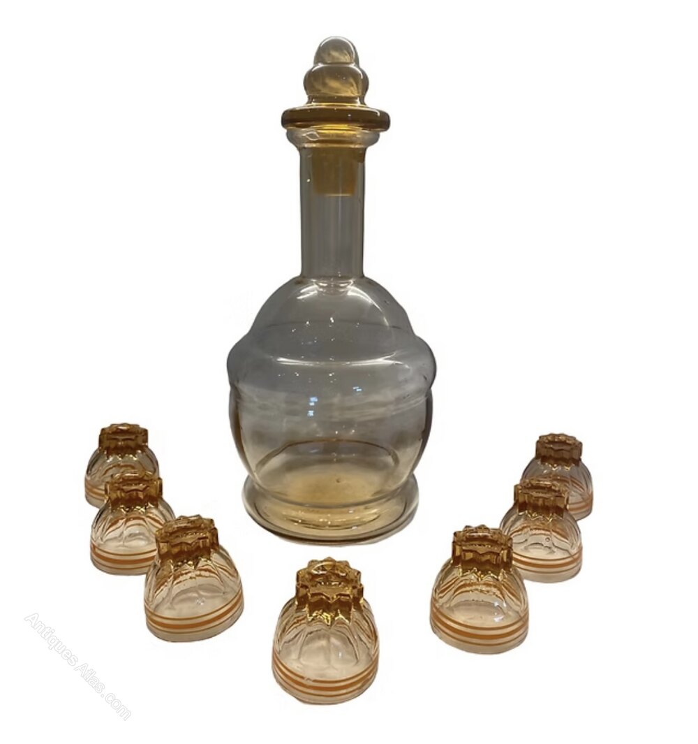 A lovely petite peach Art Deco Decanter with original stopper and matching shot glasses. These glasses are so pretty, small and well proportioned they have a star shape to their bases and peach line inlay to their middles. They are perfect for sherry or a small shot after dinner.Decanter