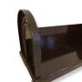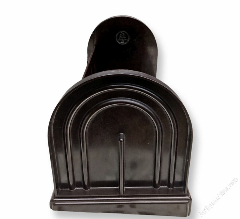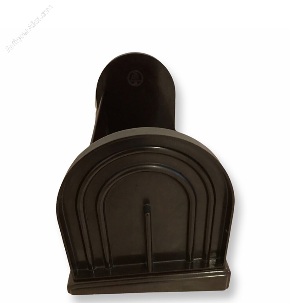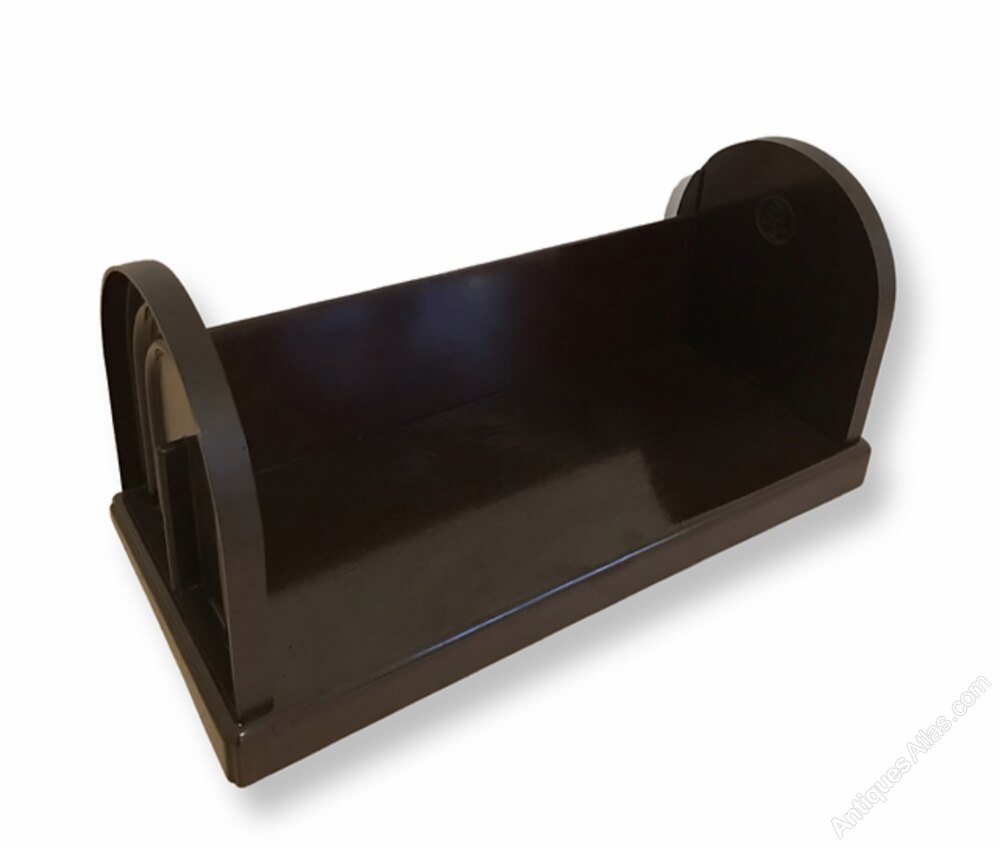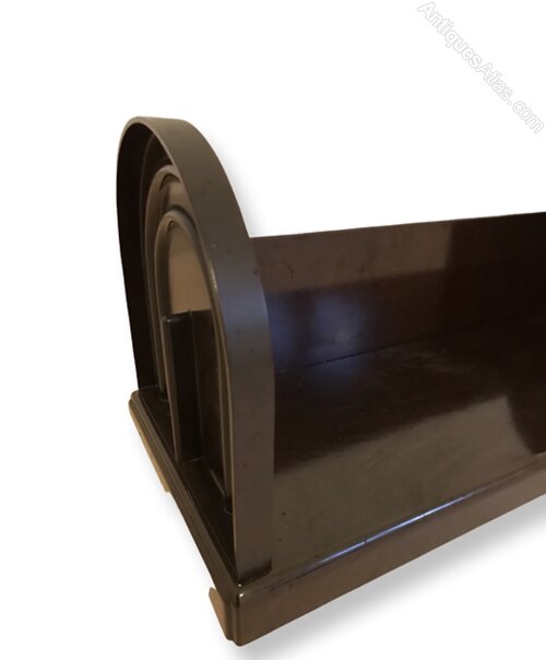 A fabulous 1930s Bakelite book trough by EBCO bookcase company, Made entirely of Bakelite, this wonderful piece has survived completely intact, with no chips or cracks or repairs. The colour is of mottled chocolate. It features 2 elliptical ends which slot into the plinth, and is slightly reclined making it easier to view your books. This is a slightly larger version than usual and would make a lovely gift for somebody. It also flat packs making it easy to transport if necessary.Lovely gift idea!