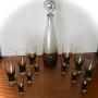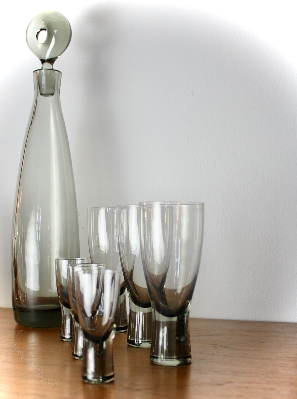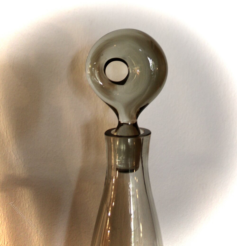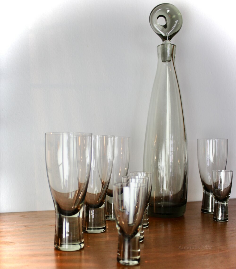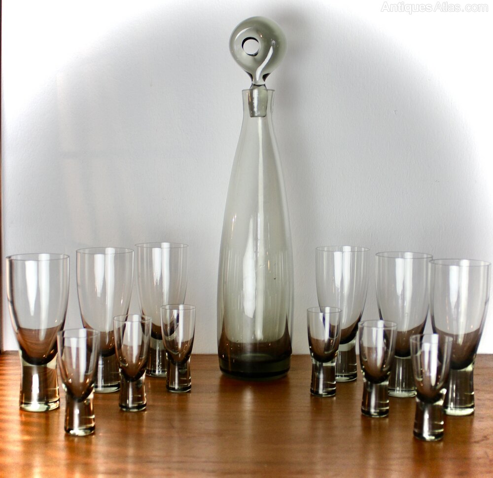 Per Lutken smoky grey glass Aristocrat decanter and twelve glasses. Per Lutken smoky grey glass Aristocrat decanter with stopper and six matching glasses, Holmegaard, Denmark 1956. Measures decanter 37 cm high , glasses 13.5 cm high and 8 cm highDateRetro :