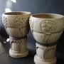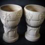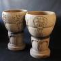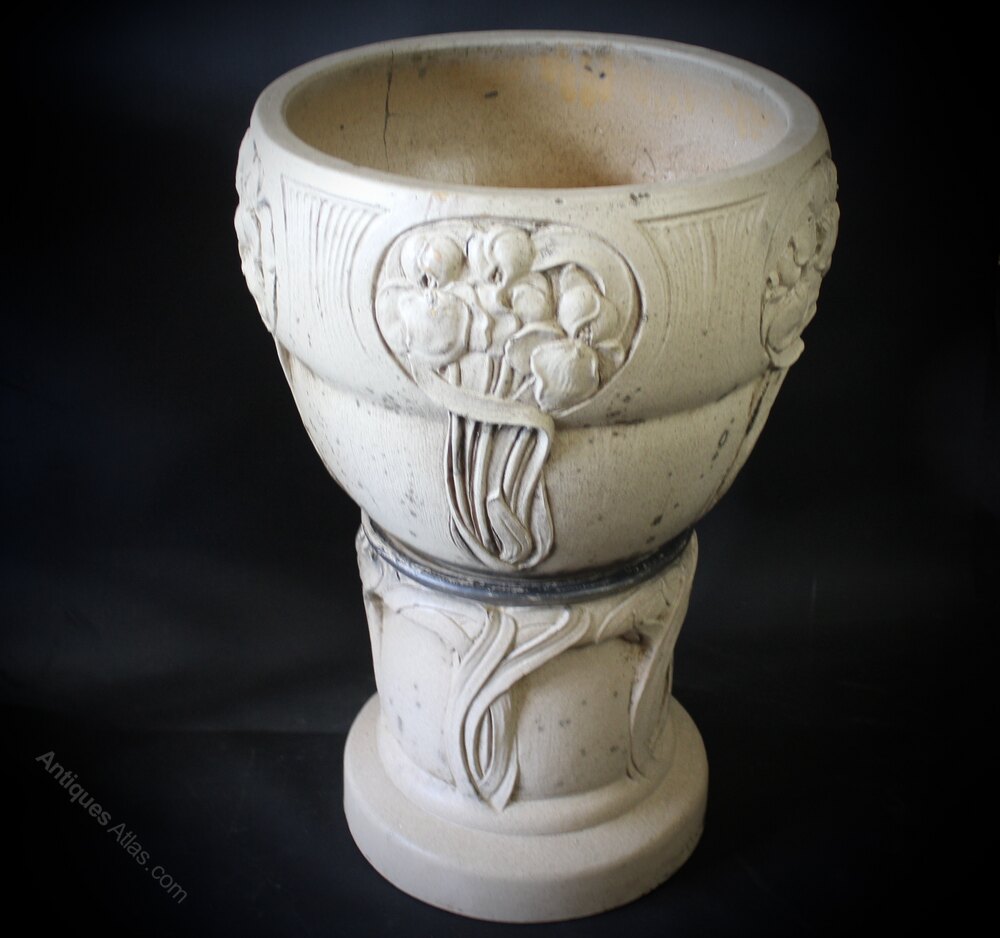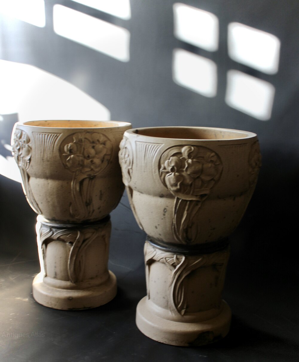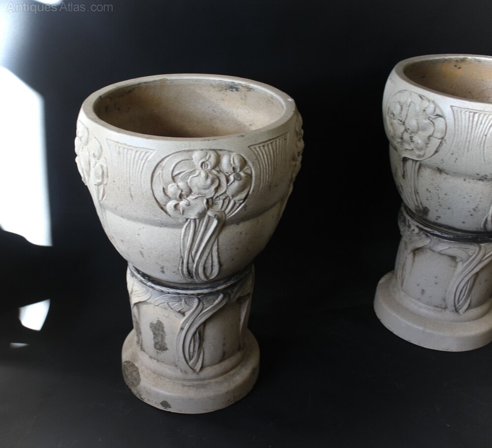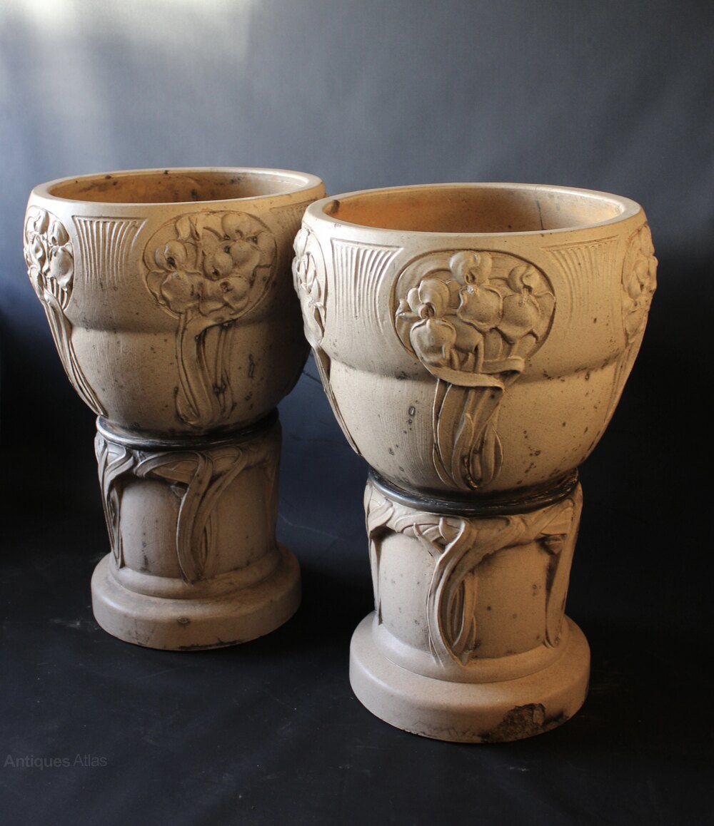 Pair of Arts and Crafts garden jardinieres on stands. Made by the Leeds Fireclay Company (LefCo) circa 1900. Some age related wear, one urn with a hairline. Overall measurements 75 cm high 50 cm diameter. Comes in two sectionsDateArts and Crafts :