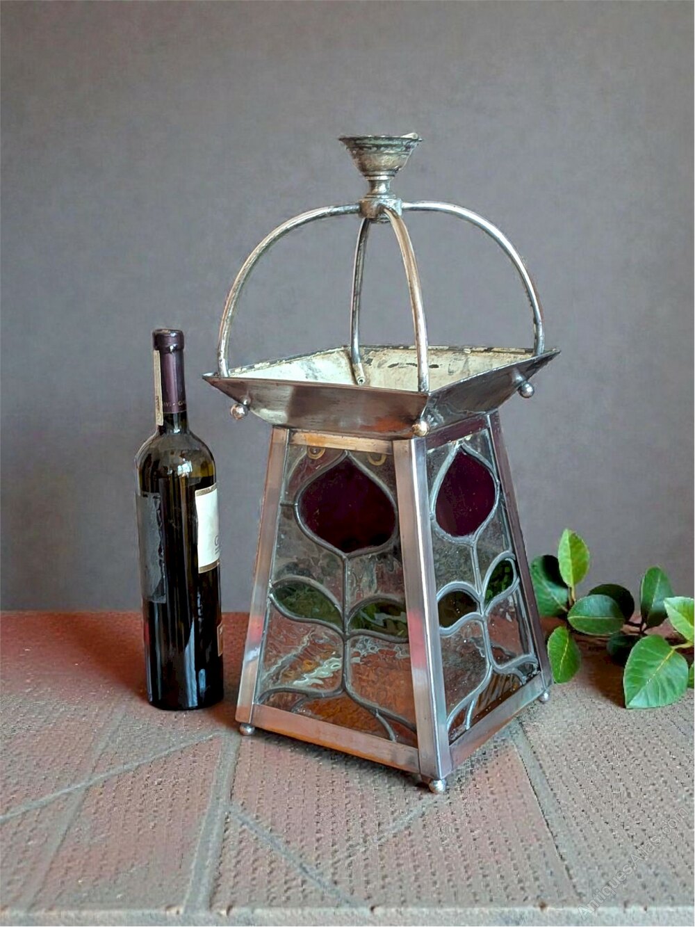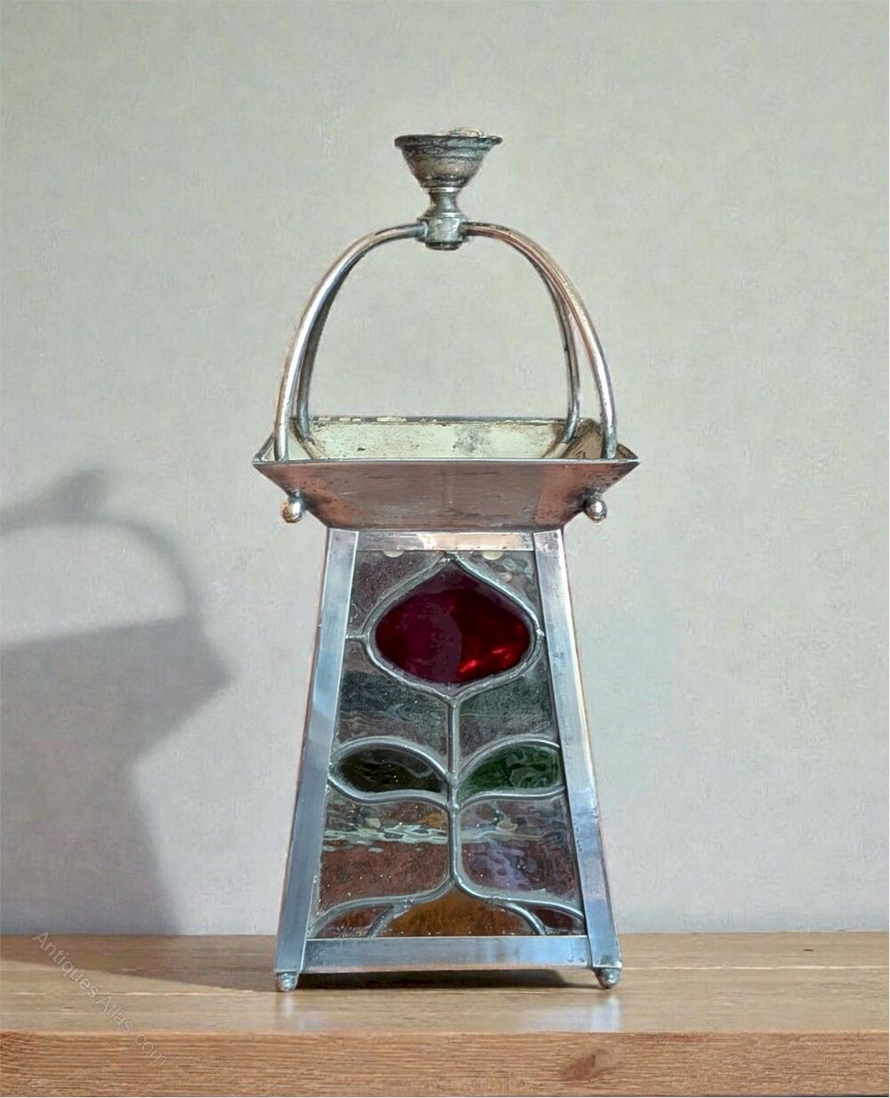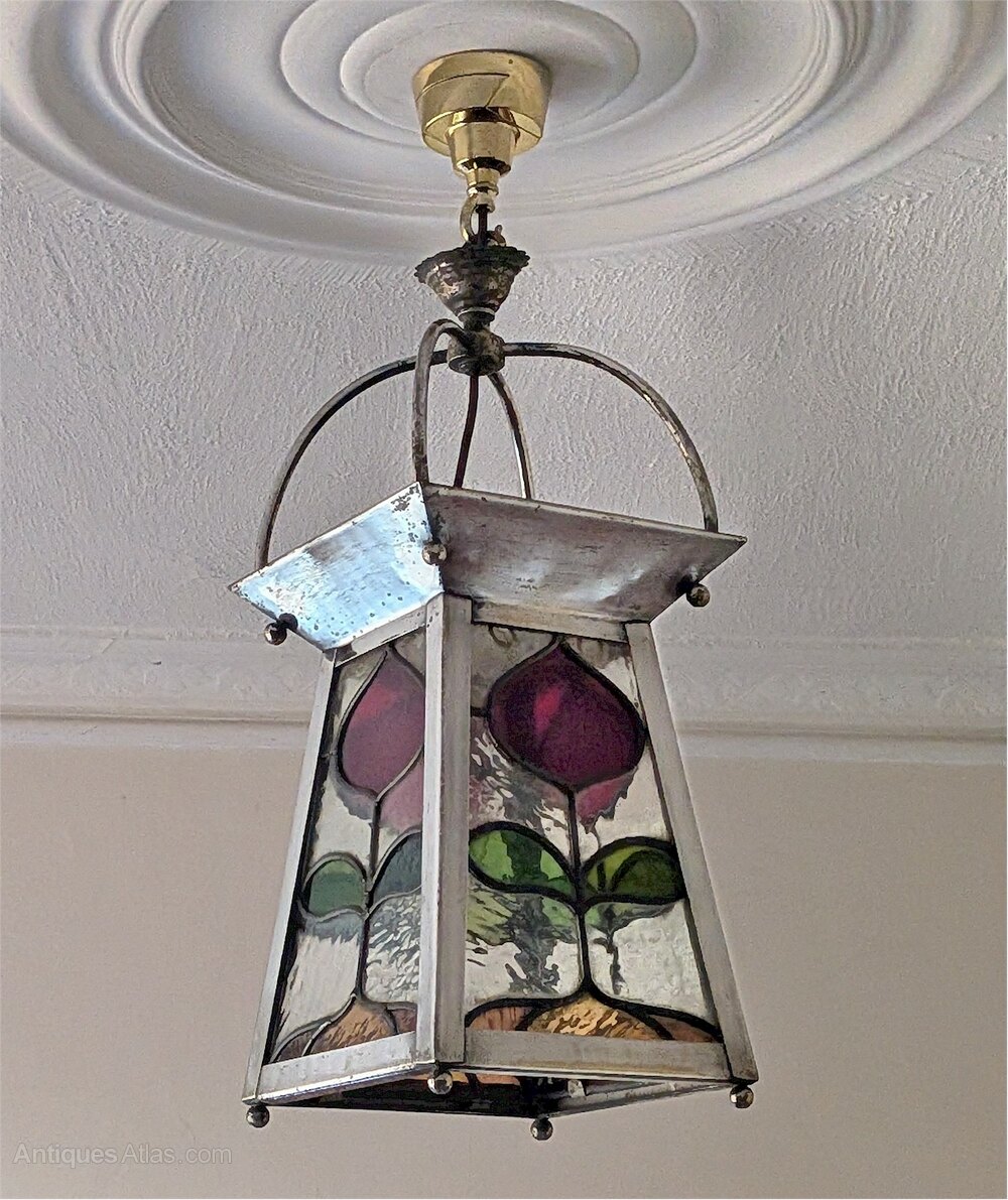 Arts and crafts leaded glass ceiling light in silver plate on brass , with stylised flower design on all sides in red , green and yellow glass . In very good original condition retaining almost all of it's silver plating and complete with it's original ceiling rose and chain .H. to start of chain 20.5"/52cm x Diam.of base 11.5"/29cm