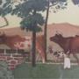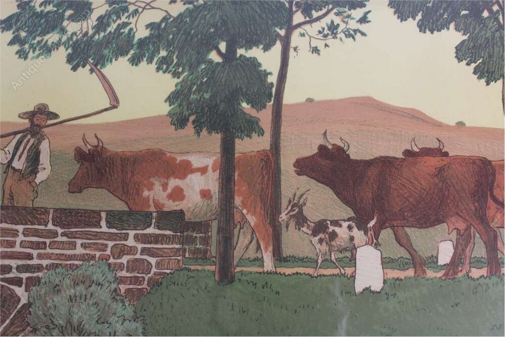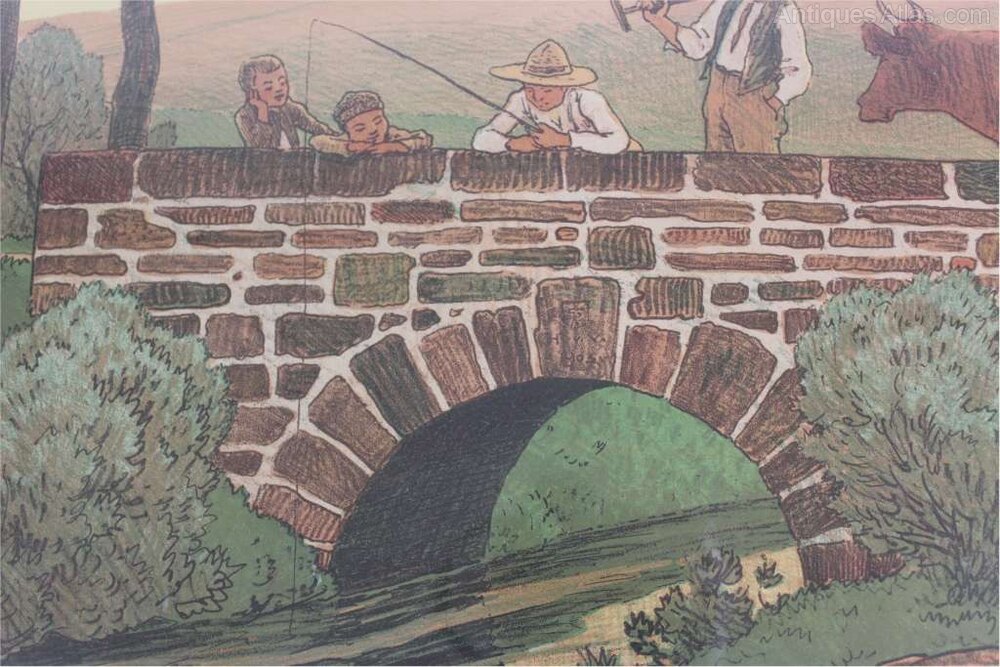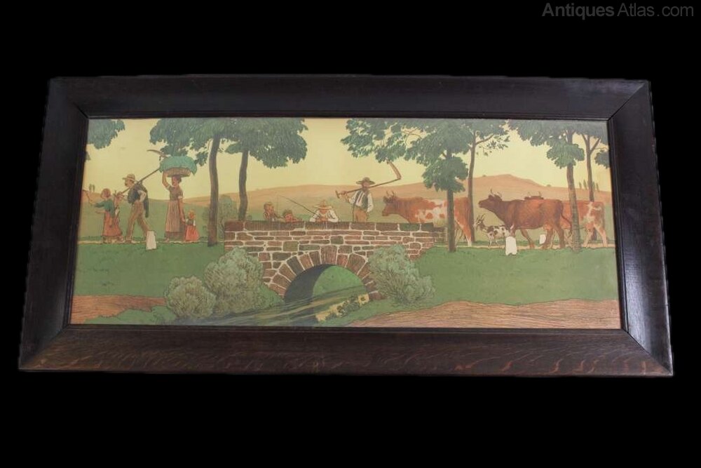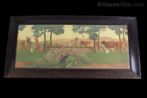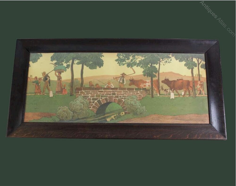 arts and crafts oak framed nursery lithograph of country folk by R.V.Volkmann A lithograph in colours of a rural farming scene by Hans Richard Von Volkmann (1860-1927) measures 56 cm high x 117 cm wide 1900DateArts and Crafts :