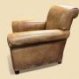 This vintage leather armchair embodies the quiet luxury of age and craftsmanship. Upholstered in warm tan hide with a beautifully distressed finish it showcases the natural patina and creasing that only time bestows.The classic silhouette features gently rolled arms, a deep cushioned seat and a subtly angled backrest for relaxed comfort.