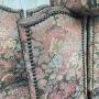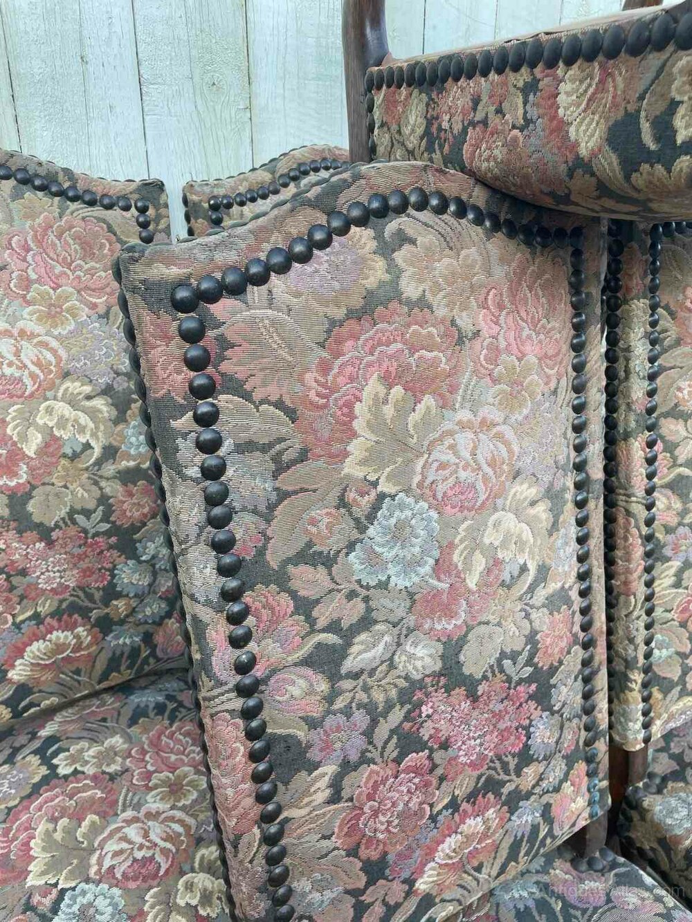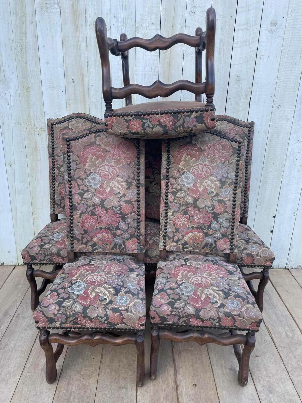 A set of 6 mid century French " os de mouton " style dining chairs.Covered in floral tapestry fabric the chairs are sound and sturdy.
