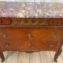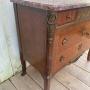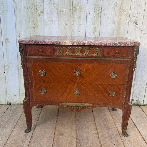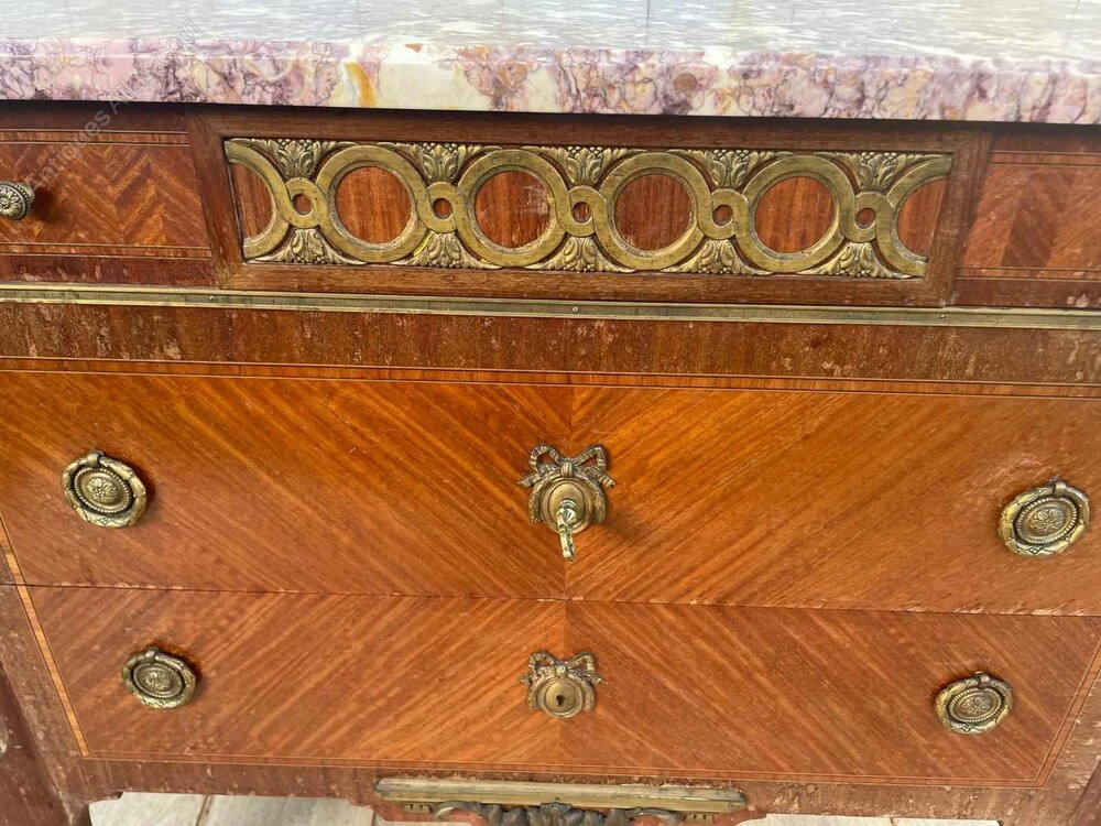 A French early 20th century commode.It features a distinctive marble top with ornate brass mounts and handles.