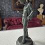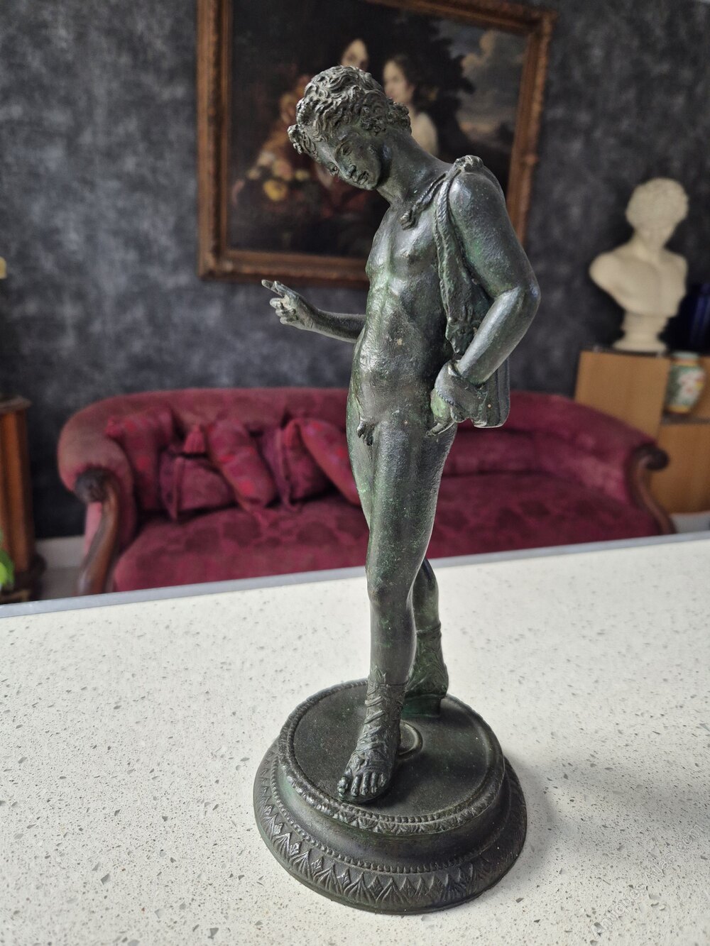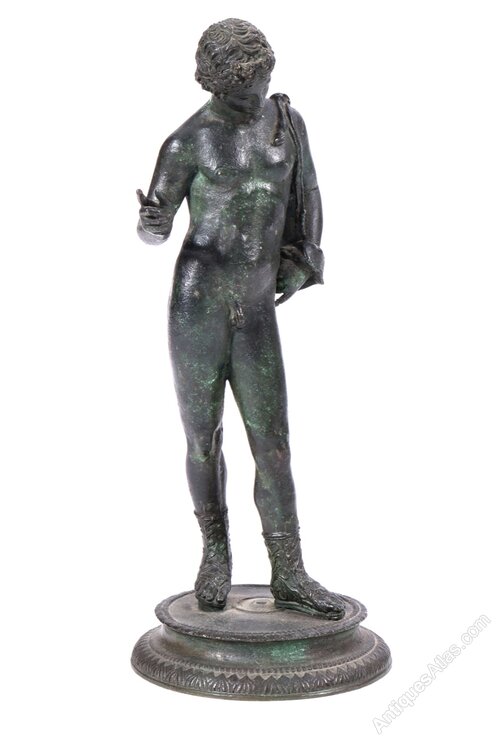 An Italian bronze representing Narcissus, Naples, 19th century.With verdigris patina, the circular base with rigid leaf decoration strips,