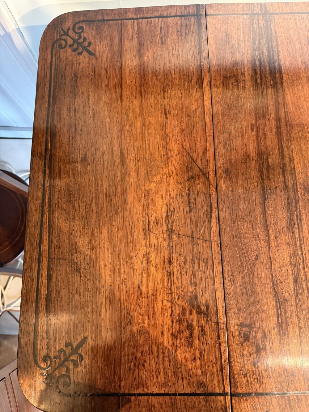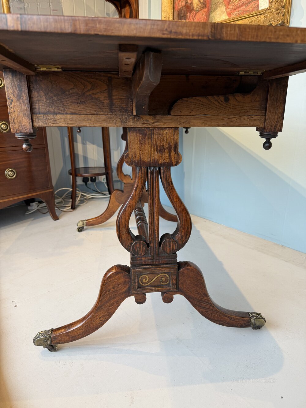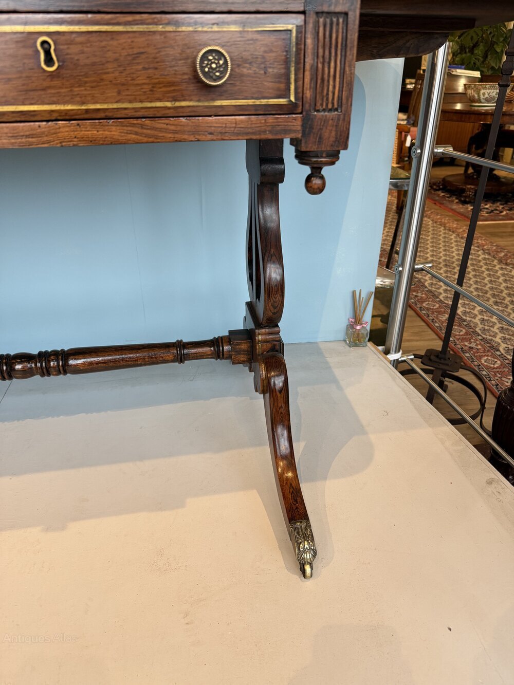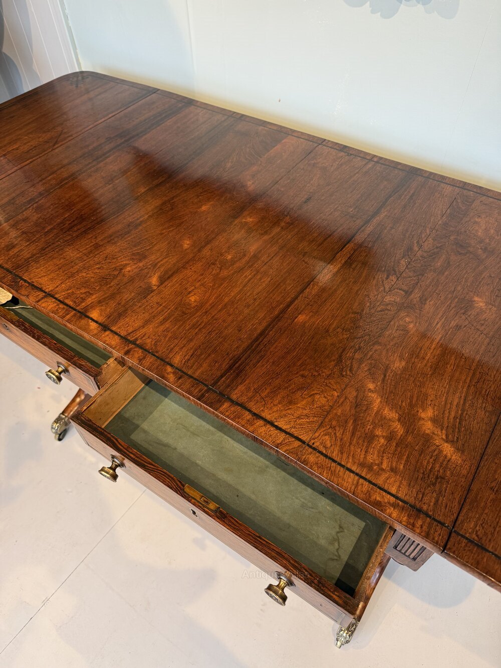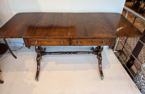 This fine Regency period sofa table with beautiful figured rosewood and inlay with ebony to the top, dates to circa 1830.The rectangular surface can be extended by two drop leaves to make the table width 150cm and it has two working drawers with brass inlay and handles. It is completed by elegant lyre end supports, turned stretcher, and sabre legs with brass casters.