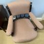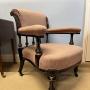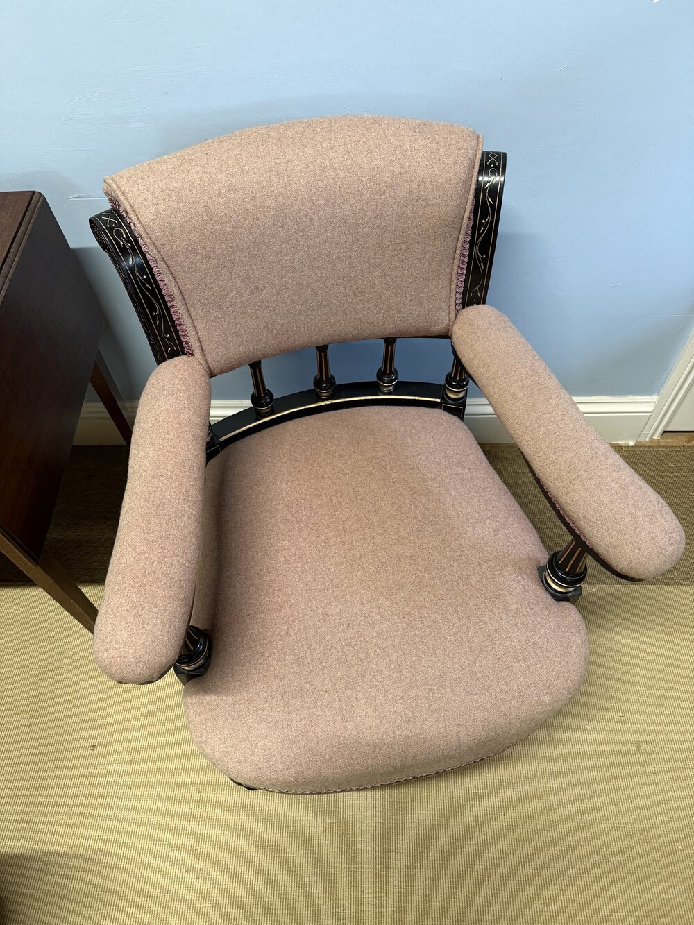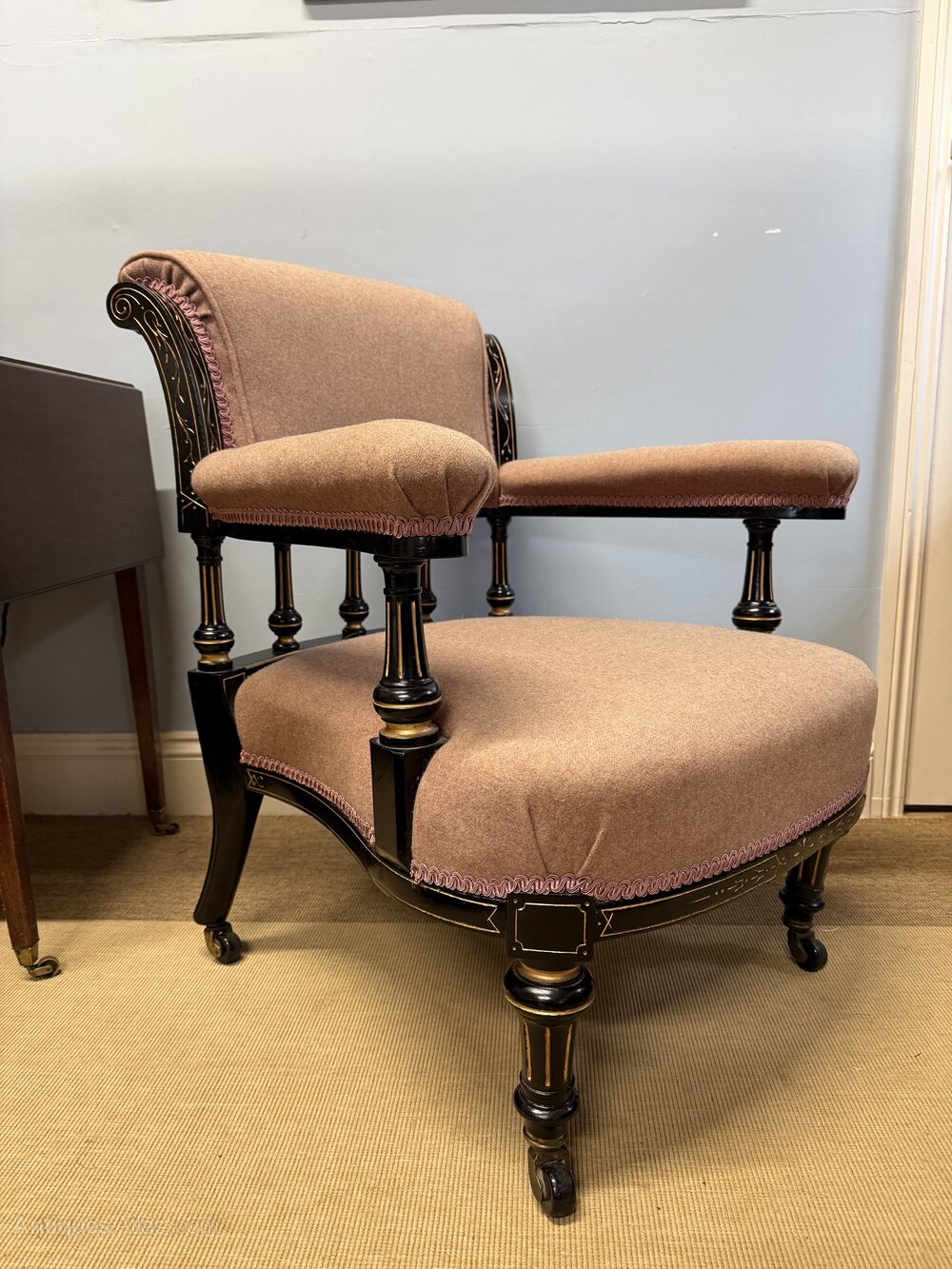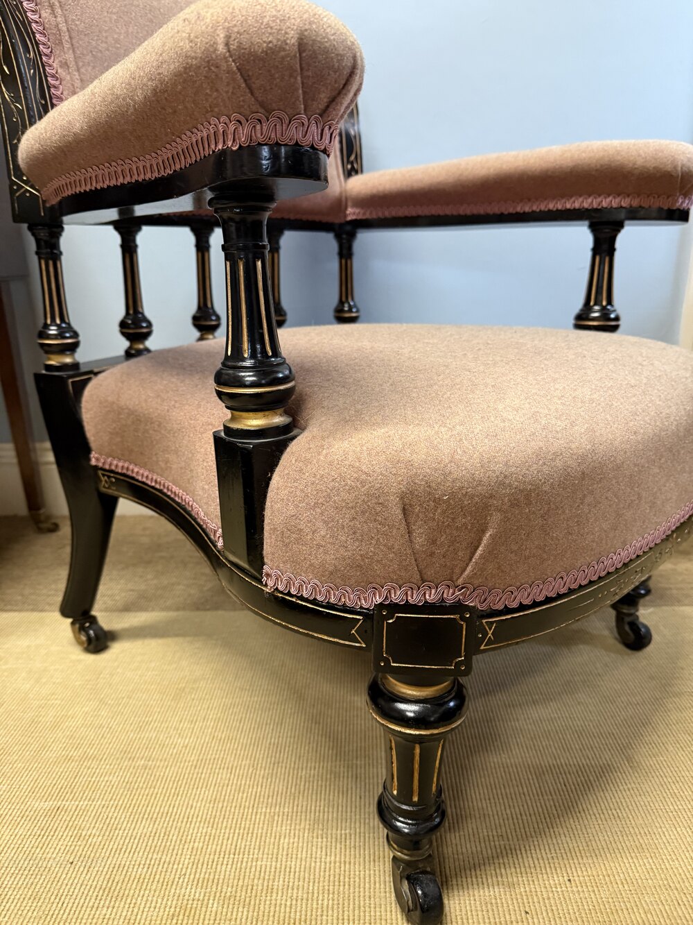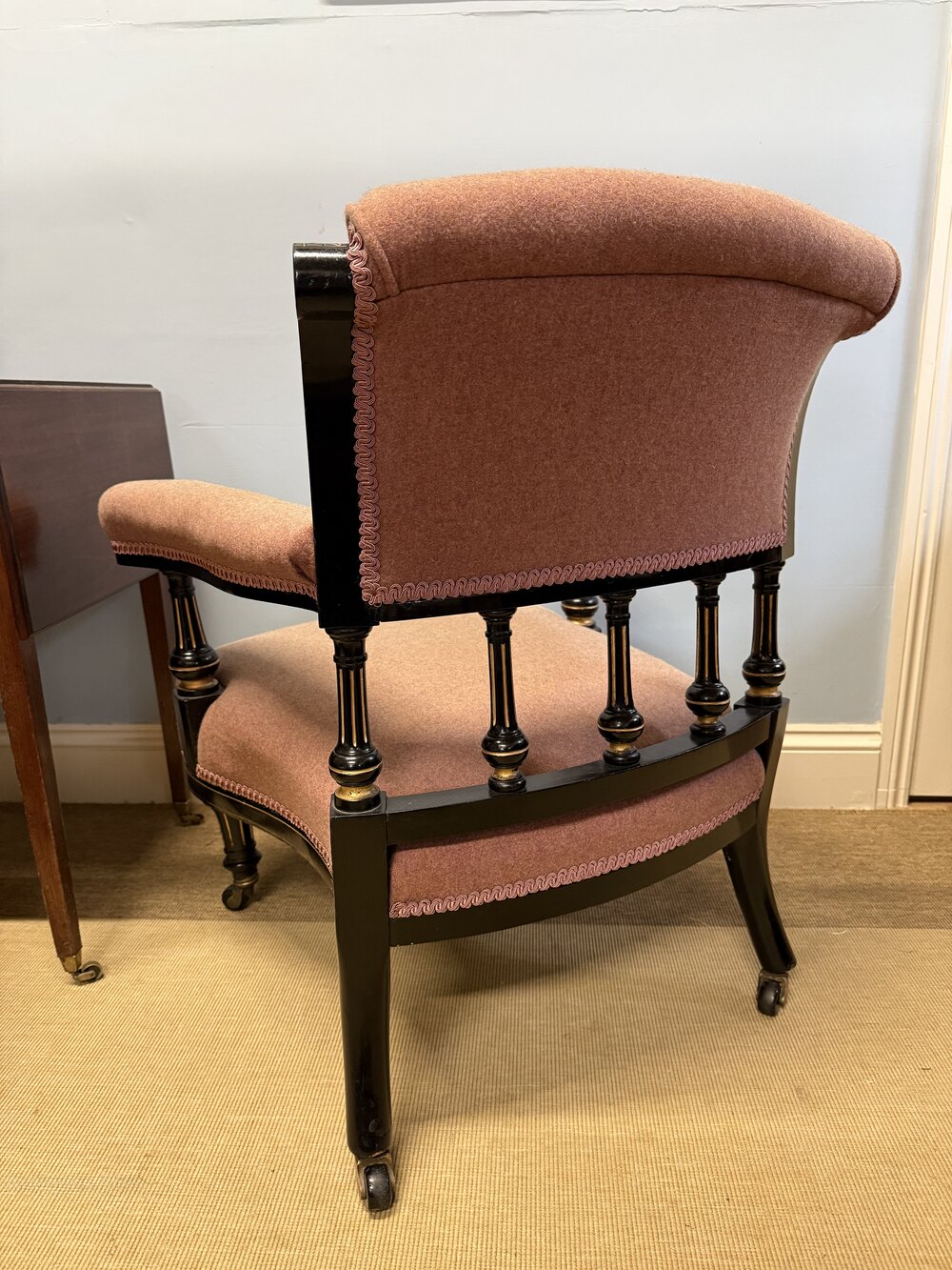 A Victorian aesthetic ebonised & gilded armchair with scrolled padded back above upholstered elbow rests on fluted spindles, the rounded sprung seat on conforming turned legs with brass & pot castors.Covered in pure wool.