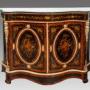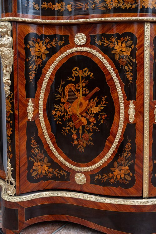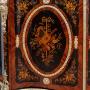 Description: Antique Napoleon III French sideboard in fine exotic woods, dating back to the second half of the 19th century.The front features two hinged doors with a floral inlay in the center.