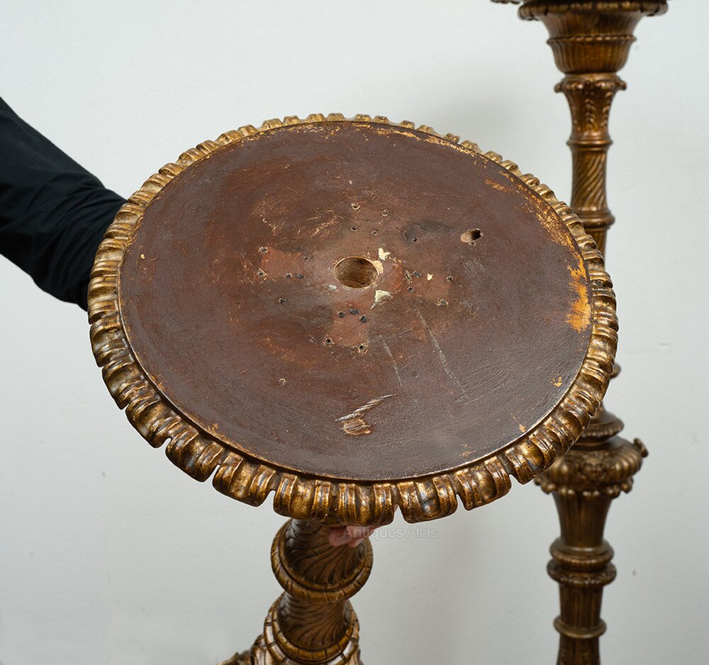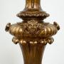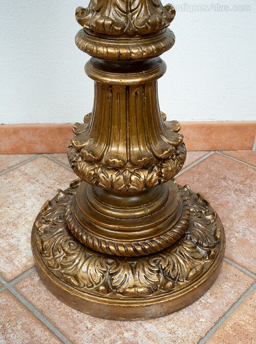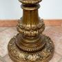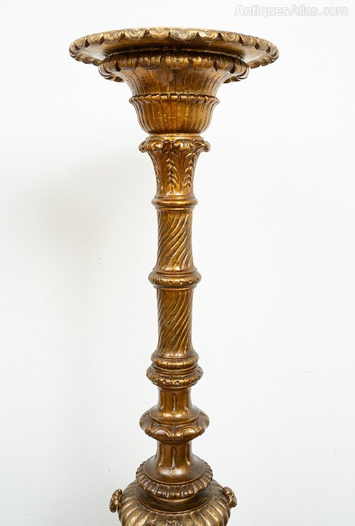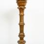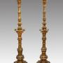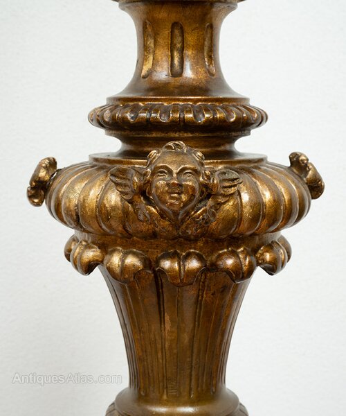 Description: A pair of Florentine torch holders in gilded and carved wood, dating back to the mid-19th century.The central stem features a densely carved leaf motif at the base and top, while the center features alternating pods with cherub heads.
