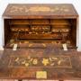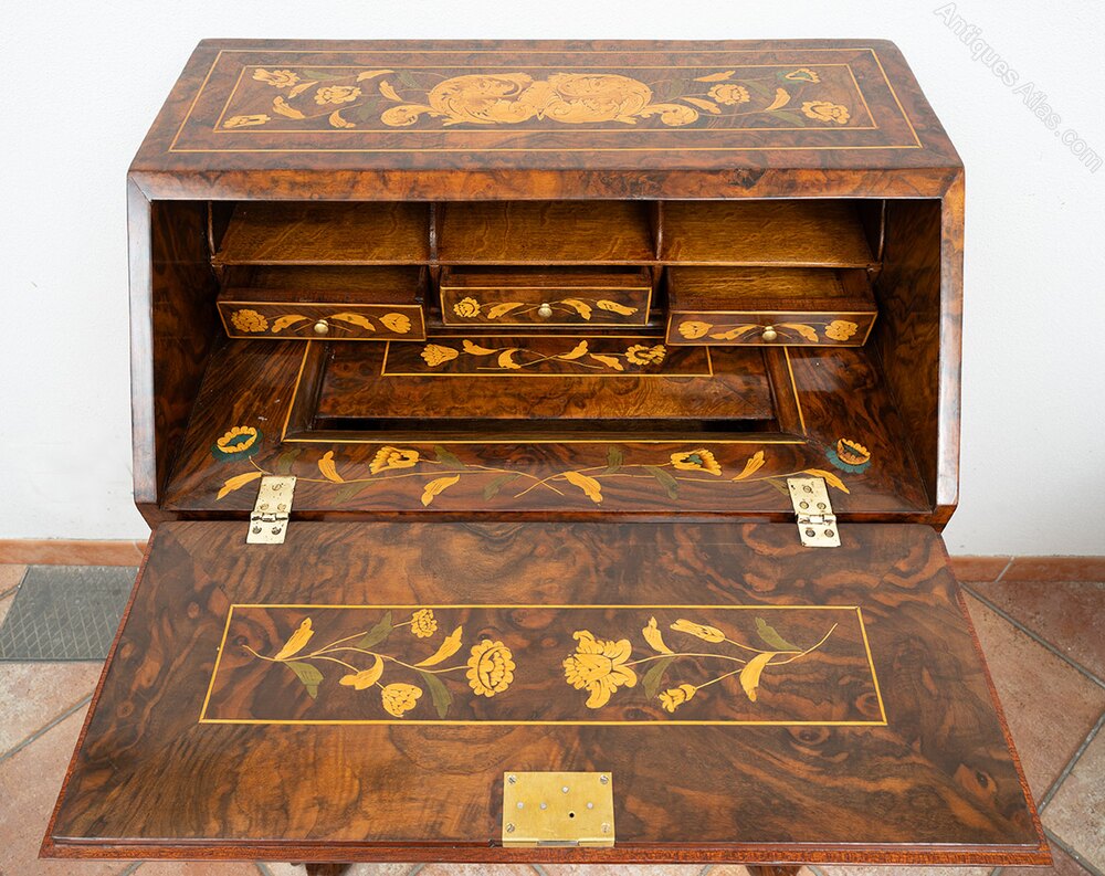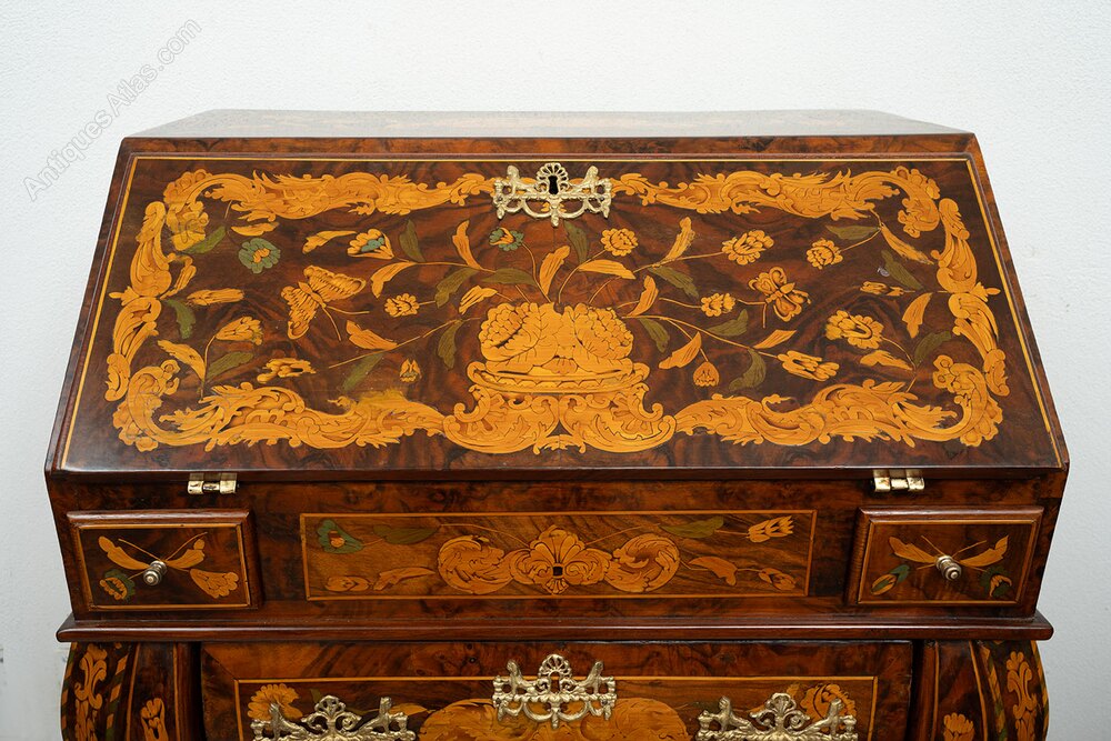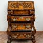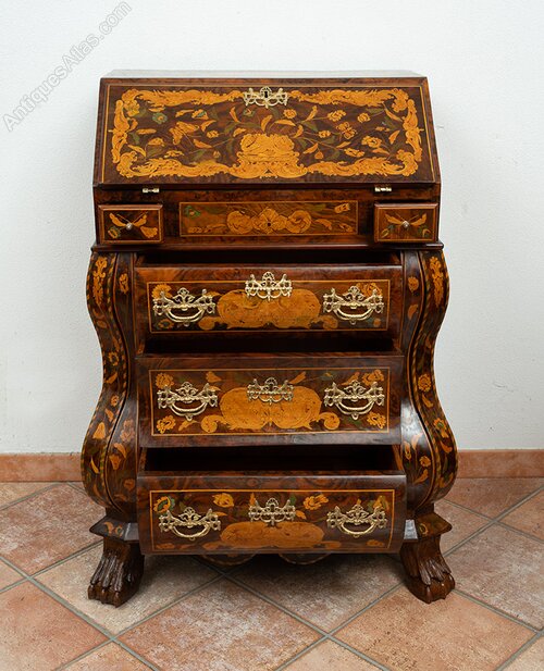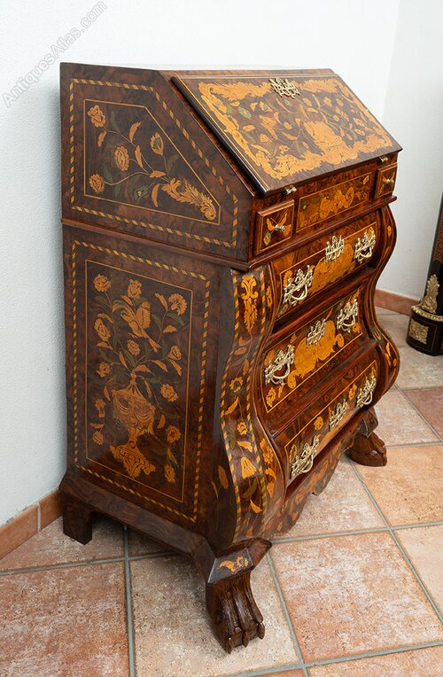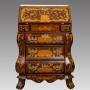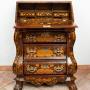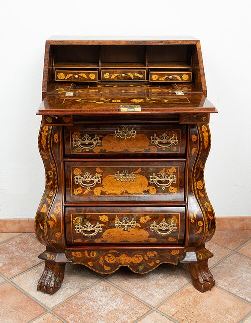 Description: Antique Dutch chest of drawers made of fine exotic woods, dating back to the early 19th century.The front features a drop-leaf door containing a series of drawers and compartments entirely inlaid with a floral motif.