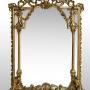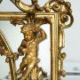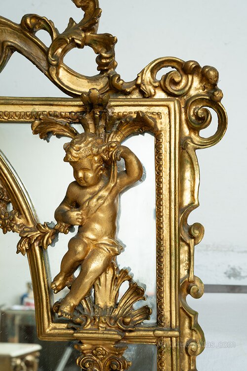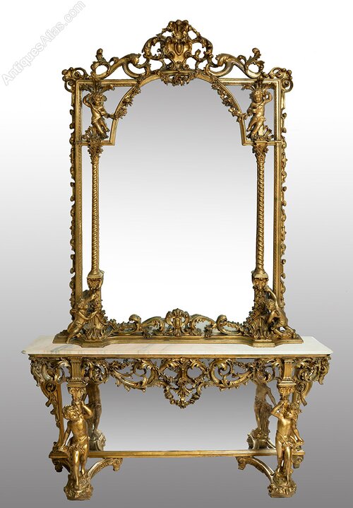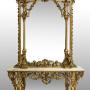 Description: Richly carved console table with integrated mirror in Baroque style, dating back to the early 1970s.The mirror features vertical uprights embellished with cherubs, an architraved frame, and a curved mirror at the top.