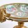 Description: Antique Napoleon III centerpiece in gilt bronze and Imari porcelain, dating back to the second half of the 19th century.The centerpiece has a circular shape with two gilt bronze side handles with a geometric section, surrounded by a raised gold trim.