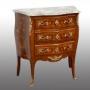Description: Antique Napoleon III chest of drawers in fine exotic woods with a marble top, dating back to the second half of the 19th century.The front features three drawers, highlighted by expertly chiseled gilded bronze handles and escutcheons.