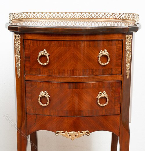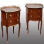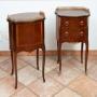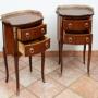 Description: A pair of antique Napoleon III mahogany bedside tables with bronze inserts, dating back to the late 19th century.The front features two drawers accented by expertly chiseled gilded bronze handles.