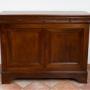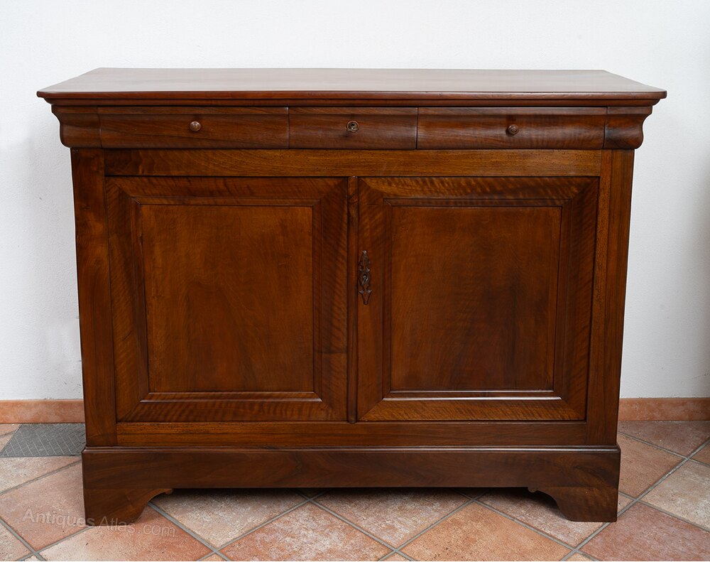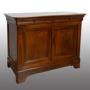 Description: Antique Provençal solid walnut sideboard from the Louis-Philippe period, early 19th century.The front features three drawers under the top and two hinged doors at the bottom.