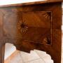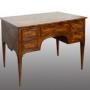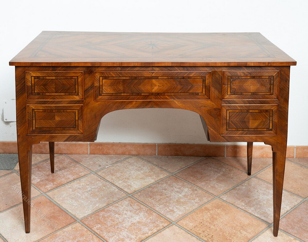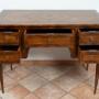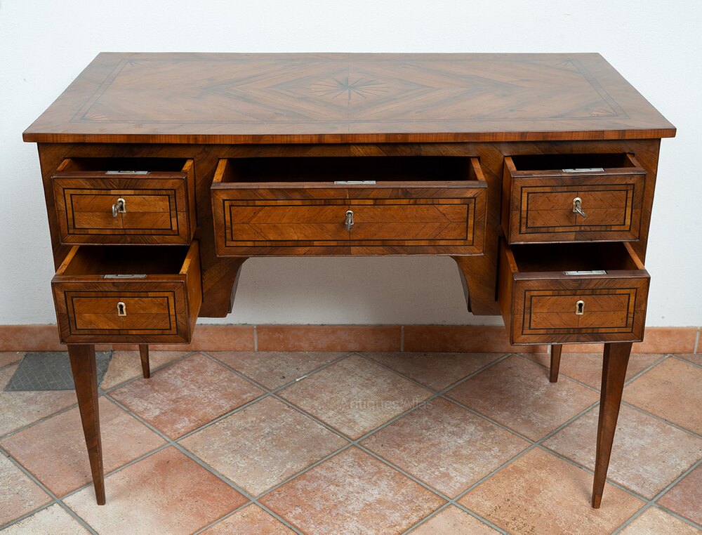 Description: Antique Louis XVI Neapolitan walnut burl centerpiece desk from the second half of the 18th century.The front features five drawers accented by double trim in fine woods.