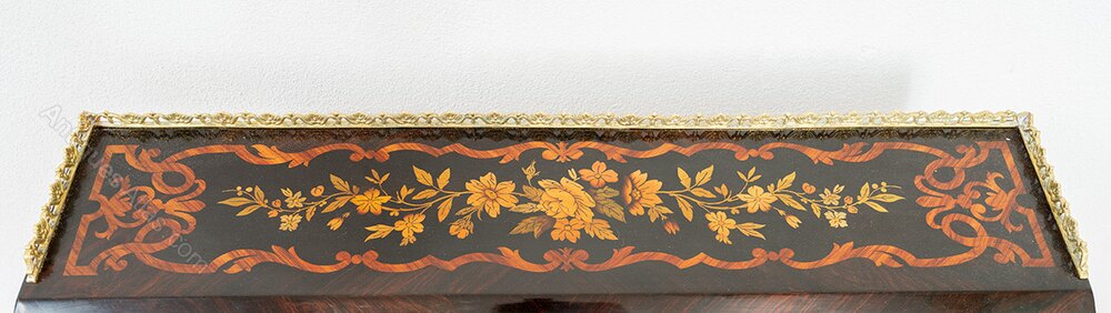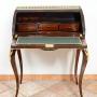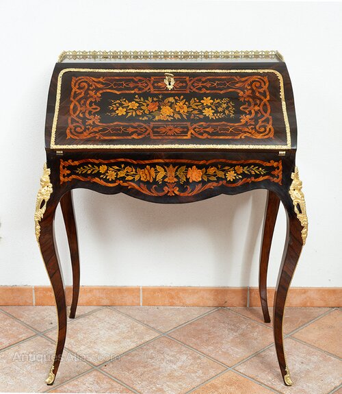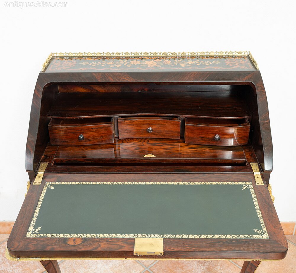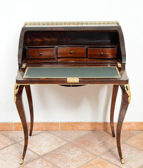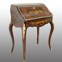 Description: Antique Napoleon III bureau made of fine exotic woods, dating back to the second half of the 19th century.The front features a drop-leaf door containing all the drawers and compartments.